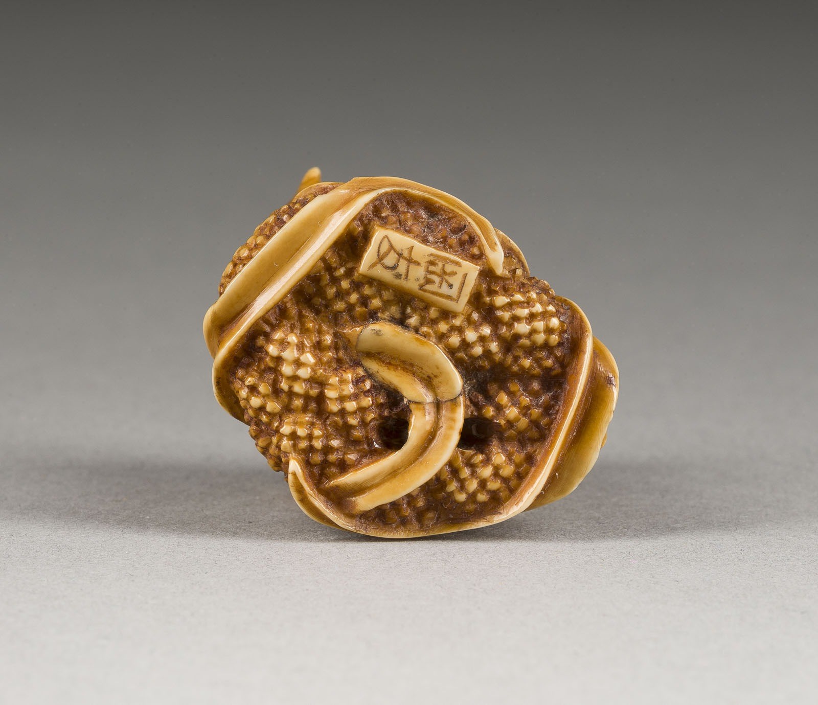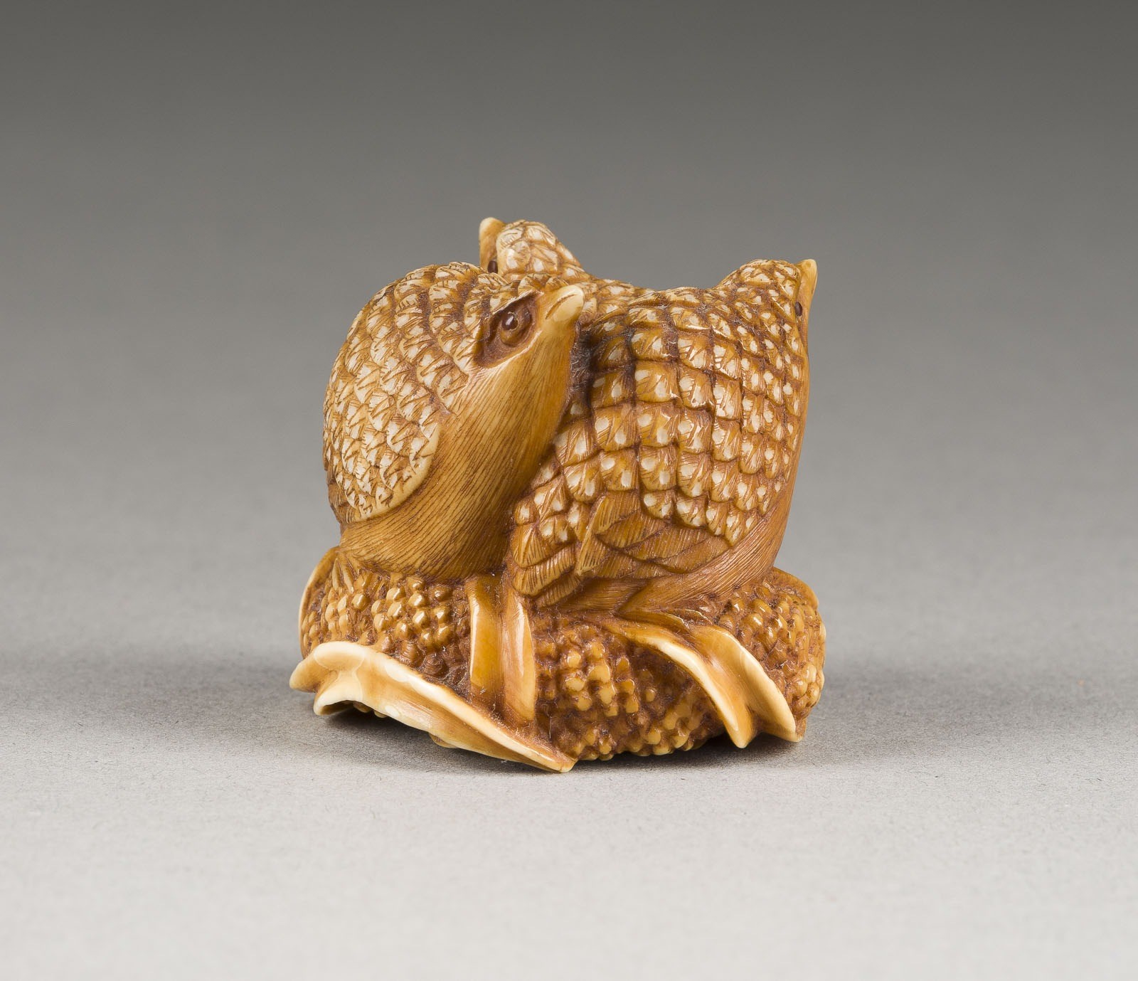 A FINE TUSK CARVED NETSUKE OF THREE QUAILS ON MILLET Japan, 19th century Walrus tusk. H. 3.1 cm. The netsuke is carved as three quails perched on leafy millet, facing in different directions. The eyes are inlaid with brown glass. Signed in a rectangular reserve 'Okatomo'. With traces of age and use, slightly damaged and restored.