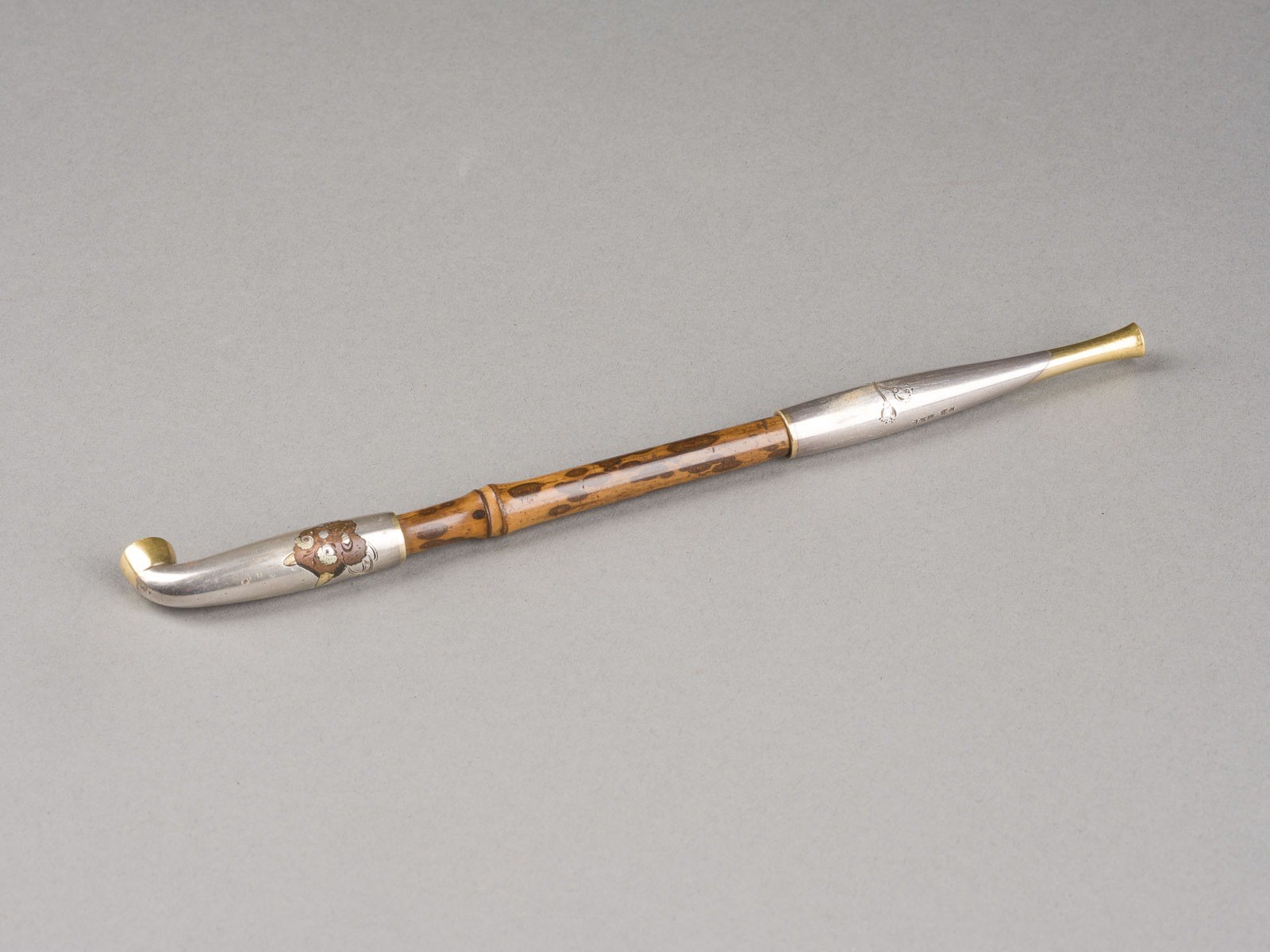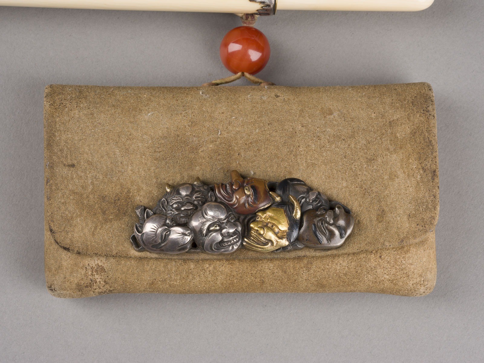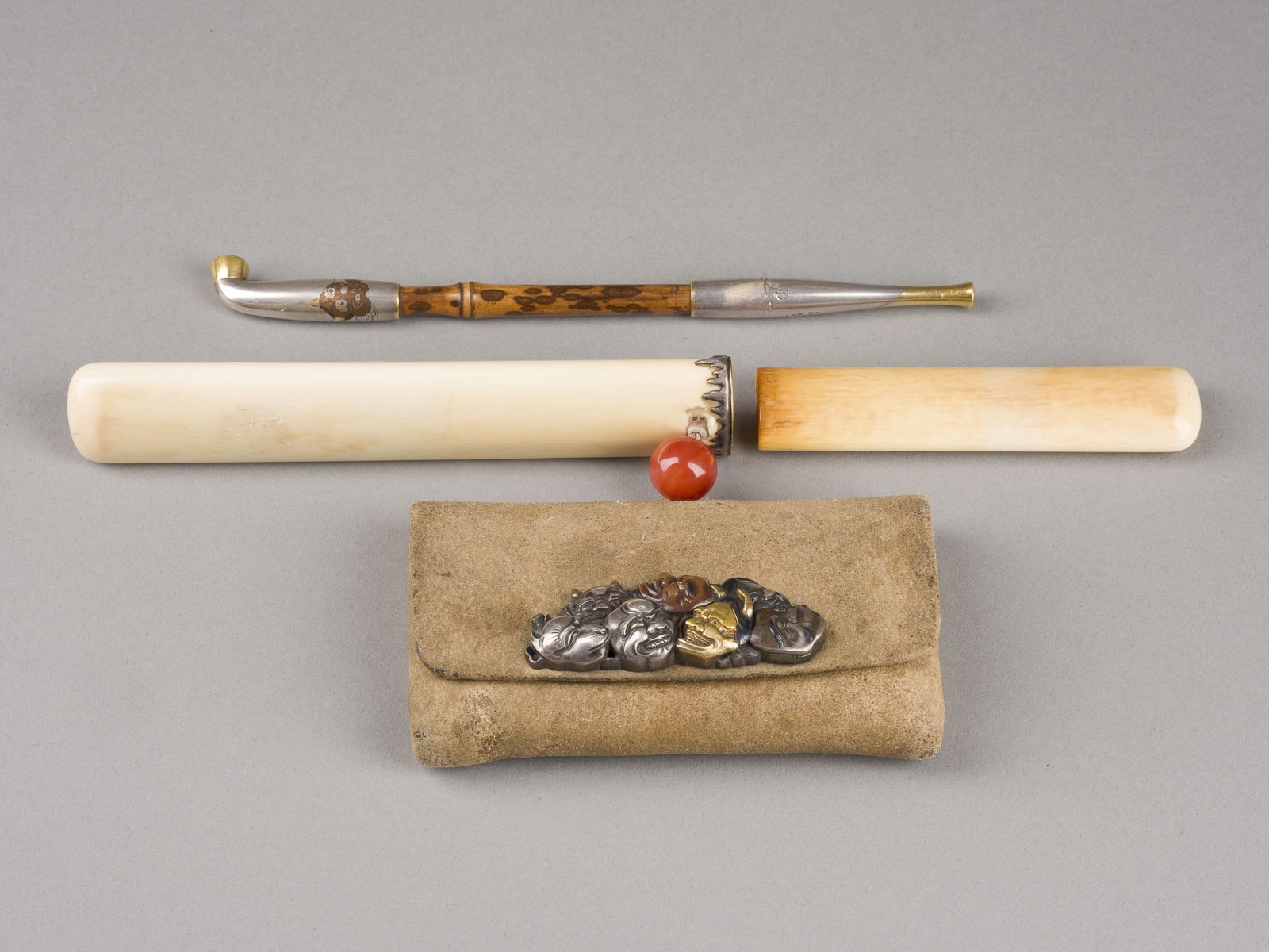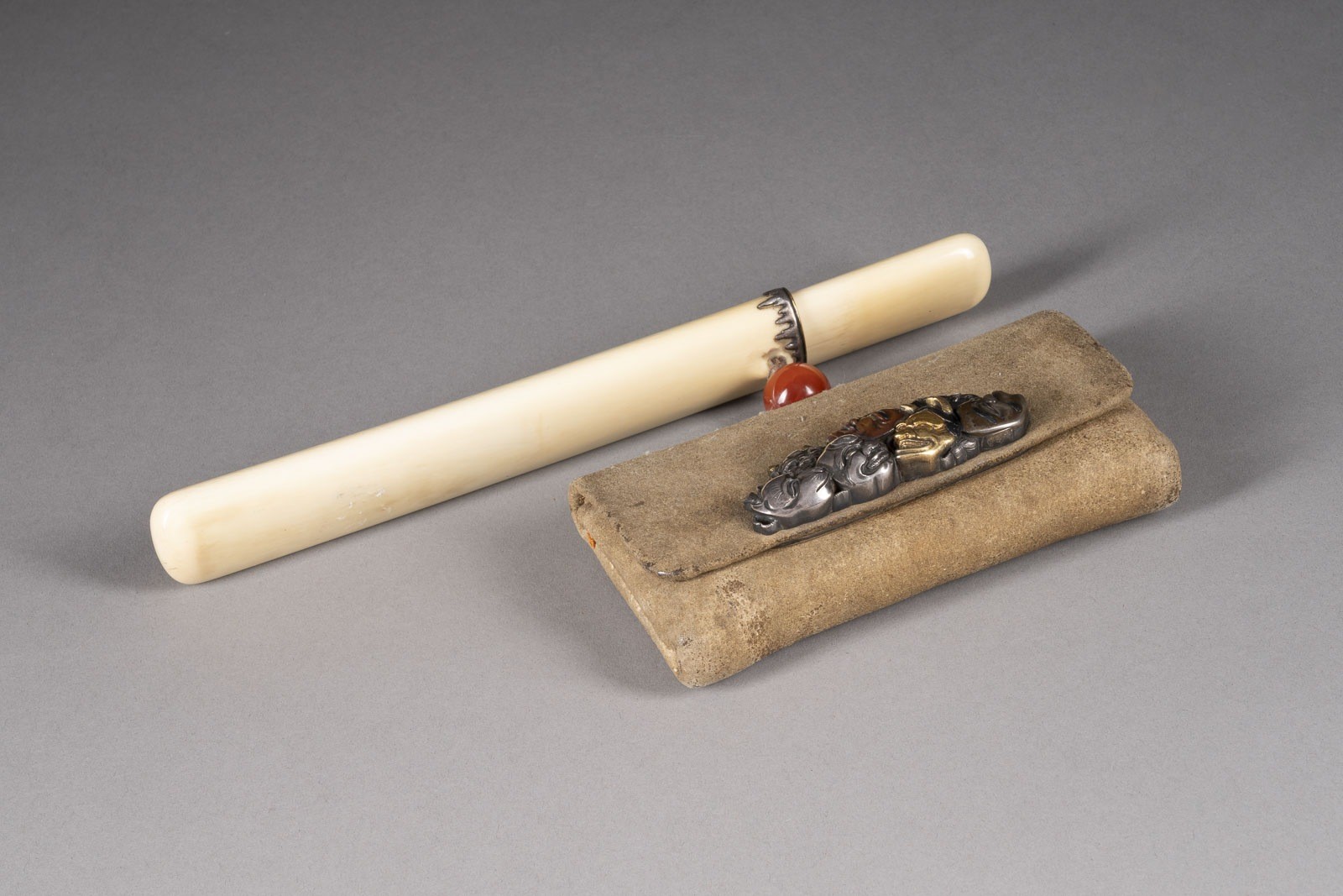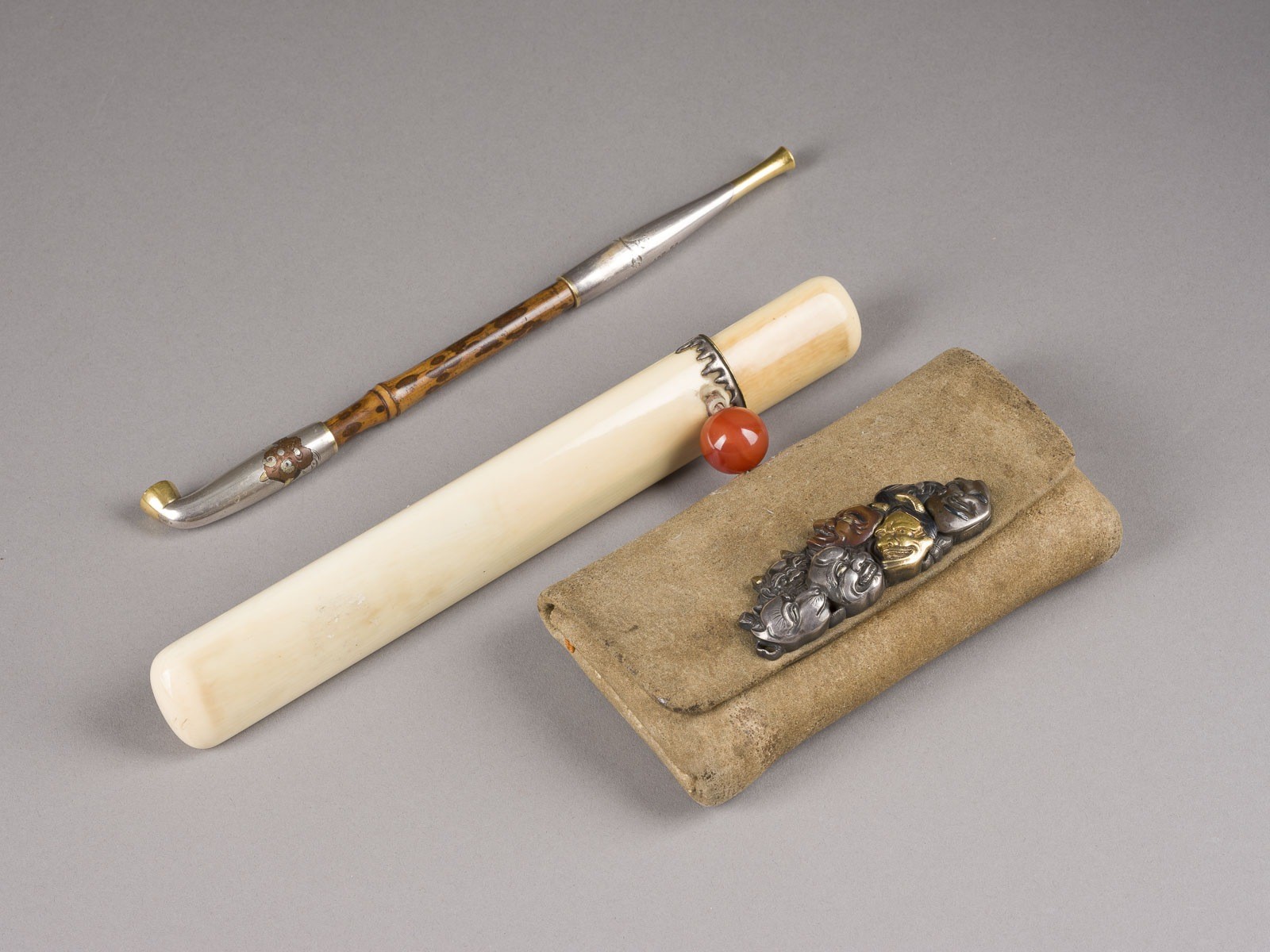 A FINE KISERUZUTSU SET Japan, Meiji-Period Ivory/leather/bamboo/metall etc.. H. 7.5-23.3 cm. The fine set comprising a kiseruzutsu (pipe case), a tabako-ire (tobacco pouch), and a signed kiseru (pipe). With traces of age and use, partially abraded. CITES marketing certificate is available.Please note that due to the current CITES regulations for ivory and tortoiseshell objects, unrestricted trade is only permitted within the European Community.