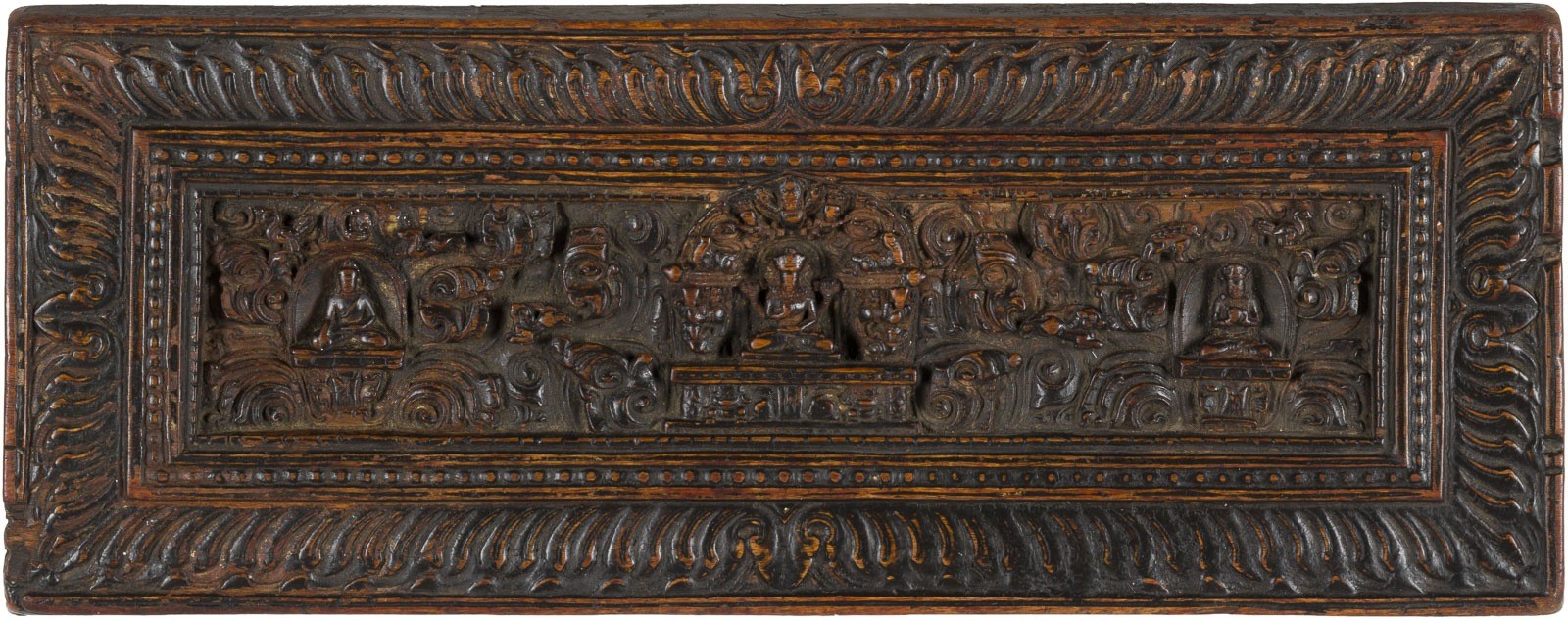 A CARVED WOOD SUTRA BOOK COVER Tibet, probably 16th/17th century Wood. 14.2x36.8 cm. With traces of age, partially abraded and damaged.