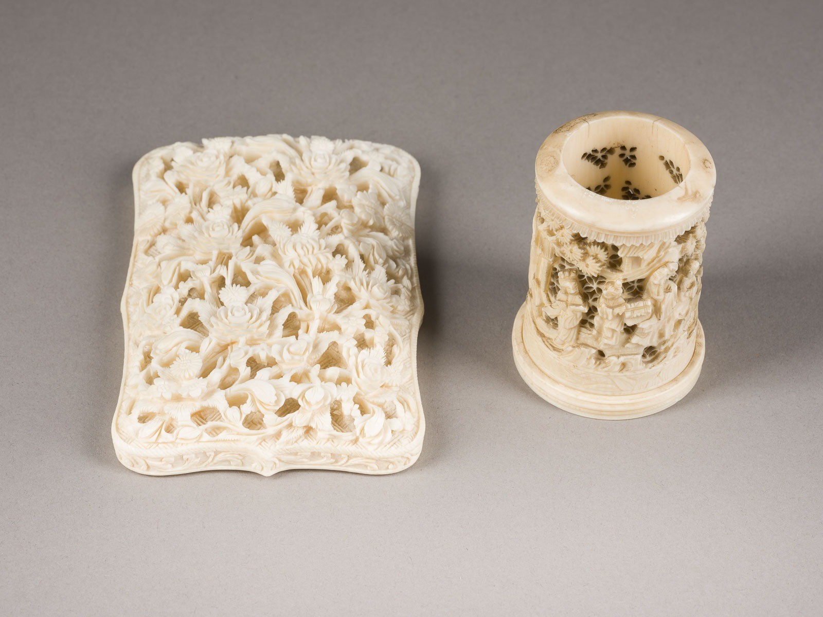 EIN GESCHNITZTES KARTETUI UND EIN GESCHNITZTER PINSELBECHER AUS ELFENBEIN