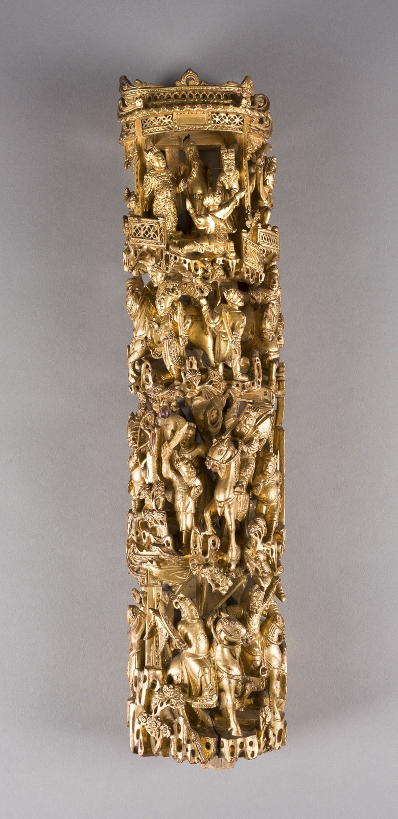 A GILT LACQUERED WOOD RELIEF COLUMN China, 19th/20th century Wood. H. 45.5 cm. The relief depicts figural scenes. With traces of age, partially damaged and cracked.