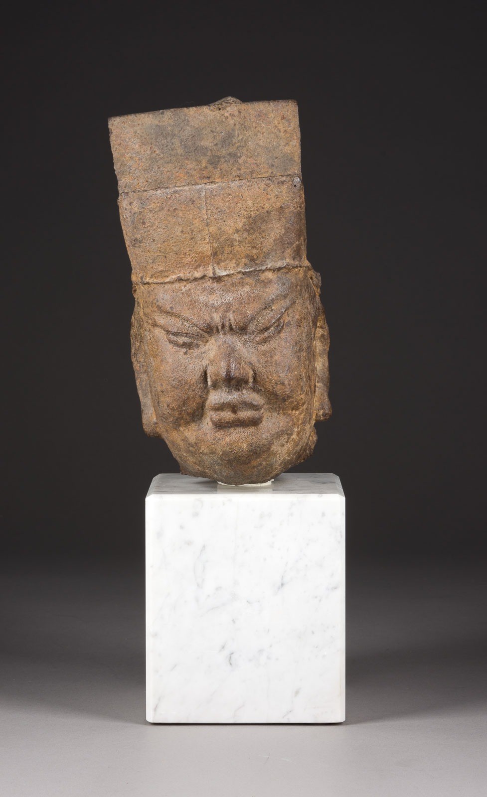 A LARGE IRON HEAD OF AN OFFICIAL China, Ming-style Iron. H. ca. 43 cm (with marble base). The head wears an official's hat and has a fierce expression. With traces of age.
