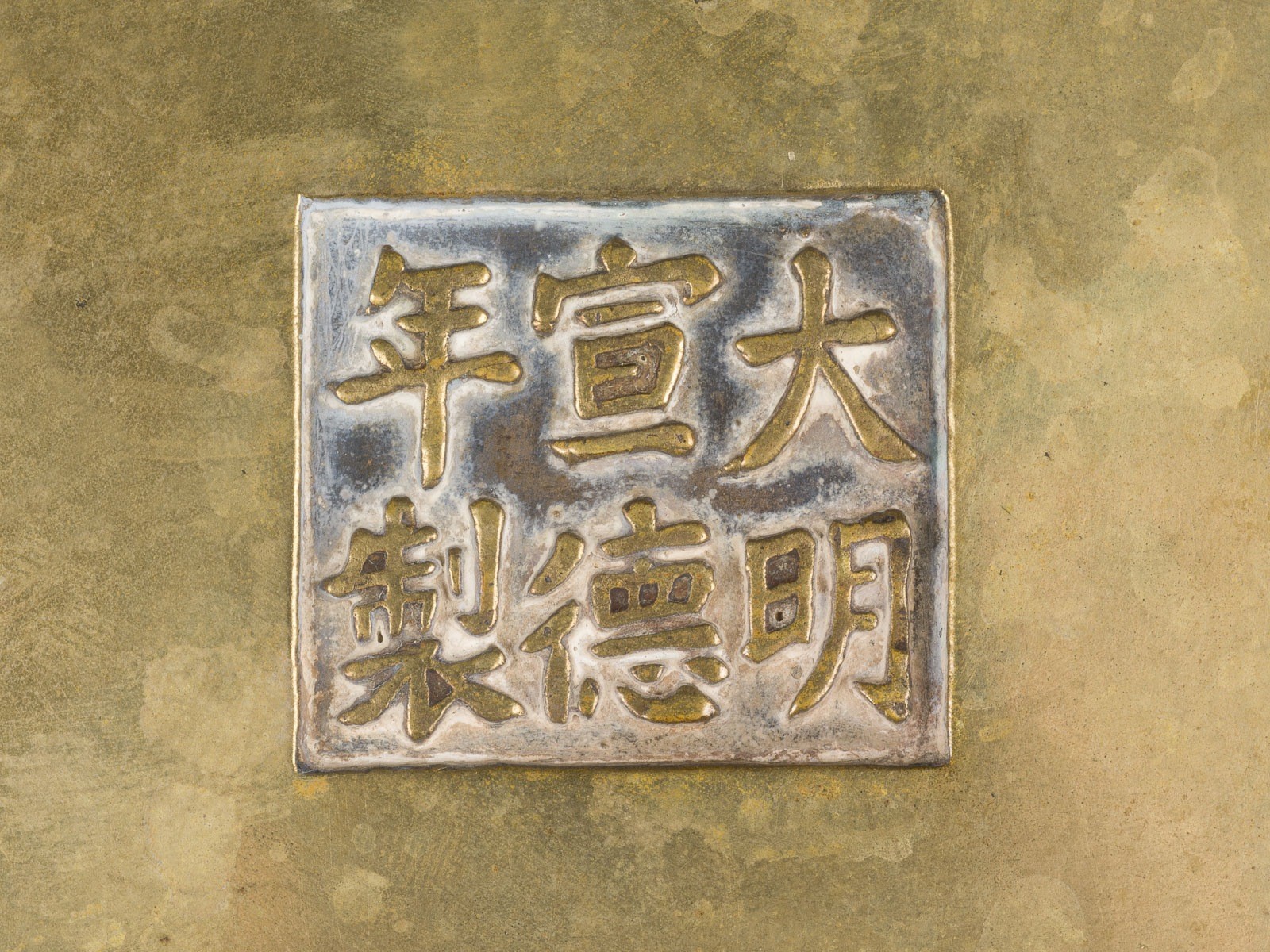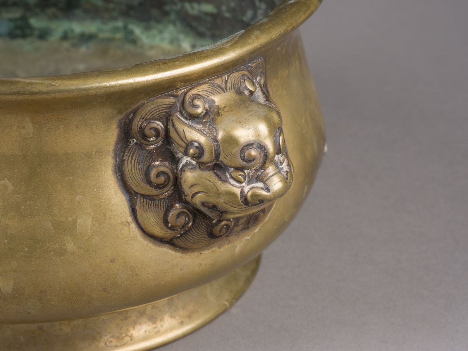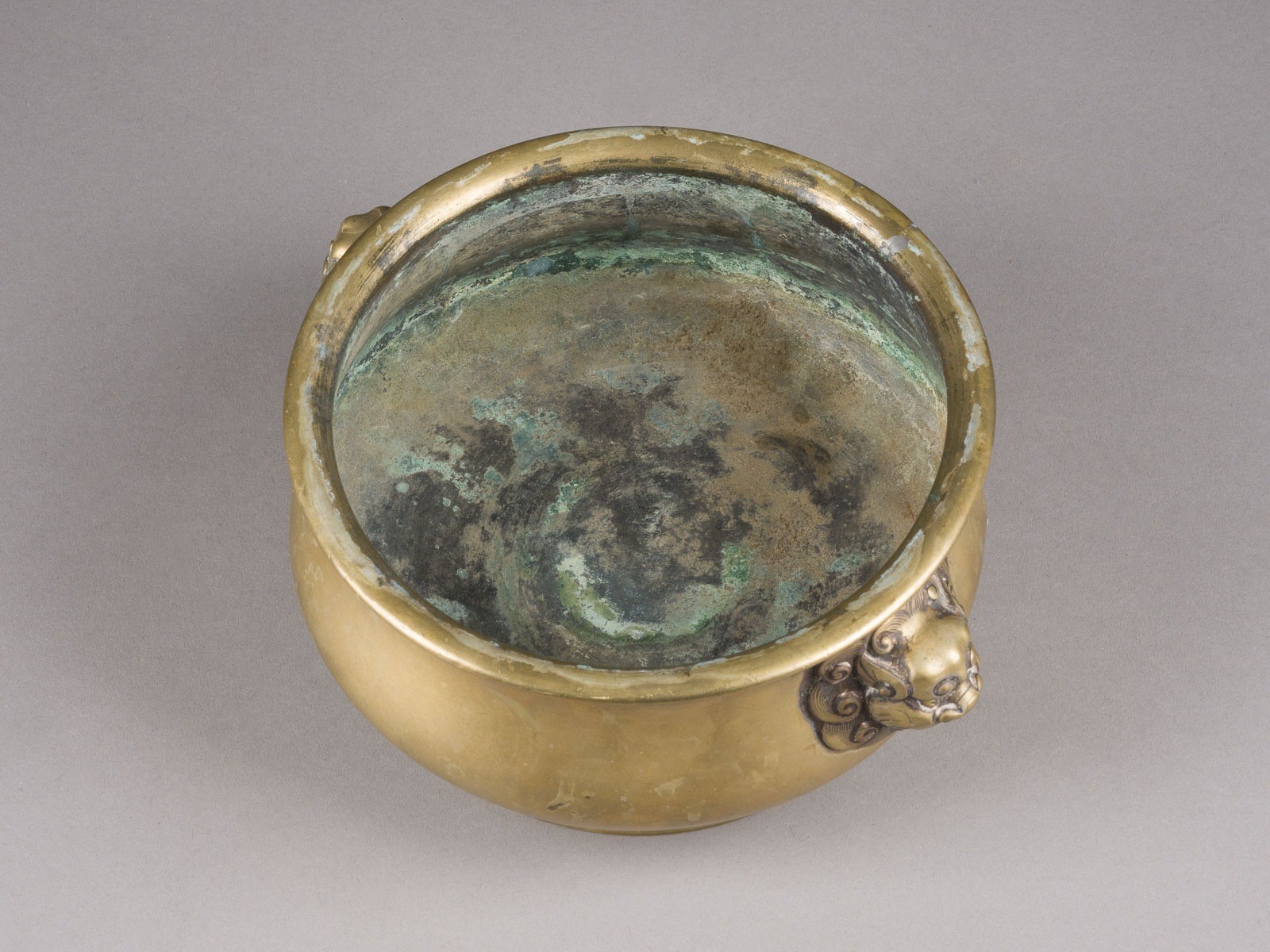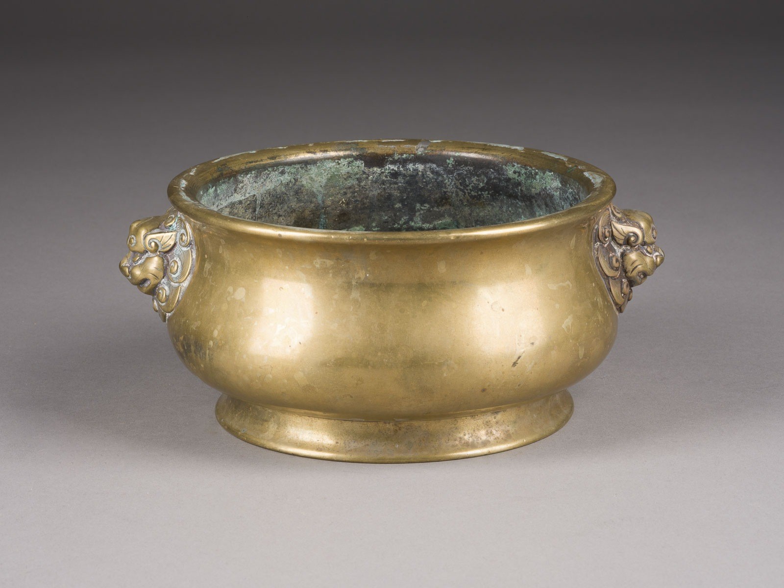 A BRASS GUI-FORM CENSER China Brass. H. 8.4 cm. The shoulders of the censer are flanked by a pair of mythical lion-head handles, each with a lion's mane. The base is cast with a six-character Xuande mark within a recessed rectangular panel. With traces of age and use, partially abraded and damaged, with one area at the rim restored. Provenance: From a private collection in North Rhine-Westphalia.
