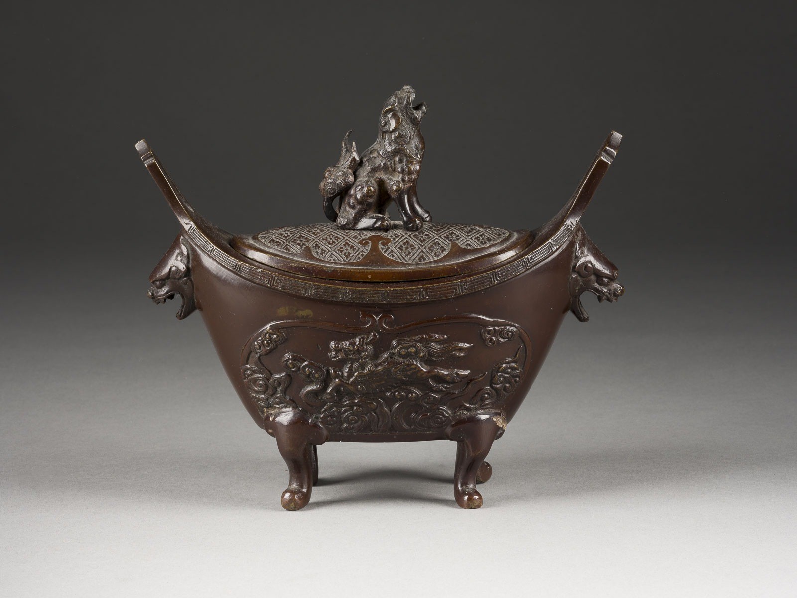 A BRONZE KORO AND COVER Japan, Meiji-period Bronze. H. 17.8 cm. The four-legged koro is decorated with two panels on the body, depicting a qilin and a tortoise. Each side of the body features a lion's head. The handle is attached in an arched shape to the body. The lid is adorned with a seated shishi, its head thrown back in a roar. The bottom is signed. With traces of age and use, slightly abraded. Provenance: From an old private collection in the southern part of North Rhine-Westphalia, acquired in 1989 from the auction house Bödiger.