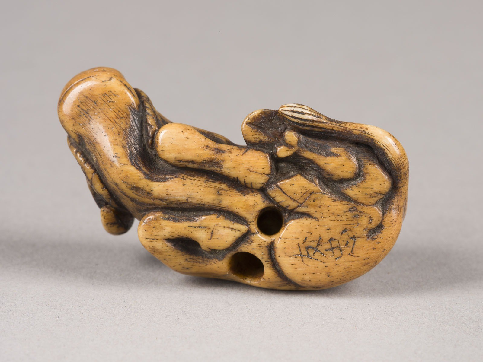 A STAG-ANTLER NETSUKE OF A RECUMBENT OX Japan, 18th/19th century Stag-antler. L. 5 cm. The netsuke is carved as a reclining ox with inlaid eyes, its head turned to the left. Signed "Tomotada" to the bottom. With traces of use and age, partially cracked.