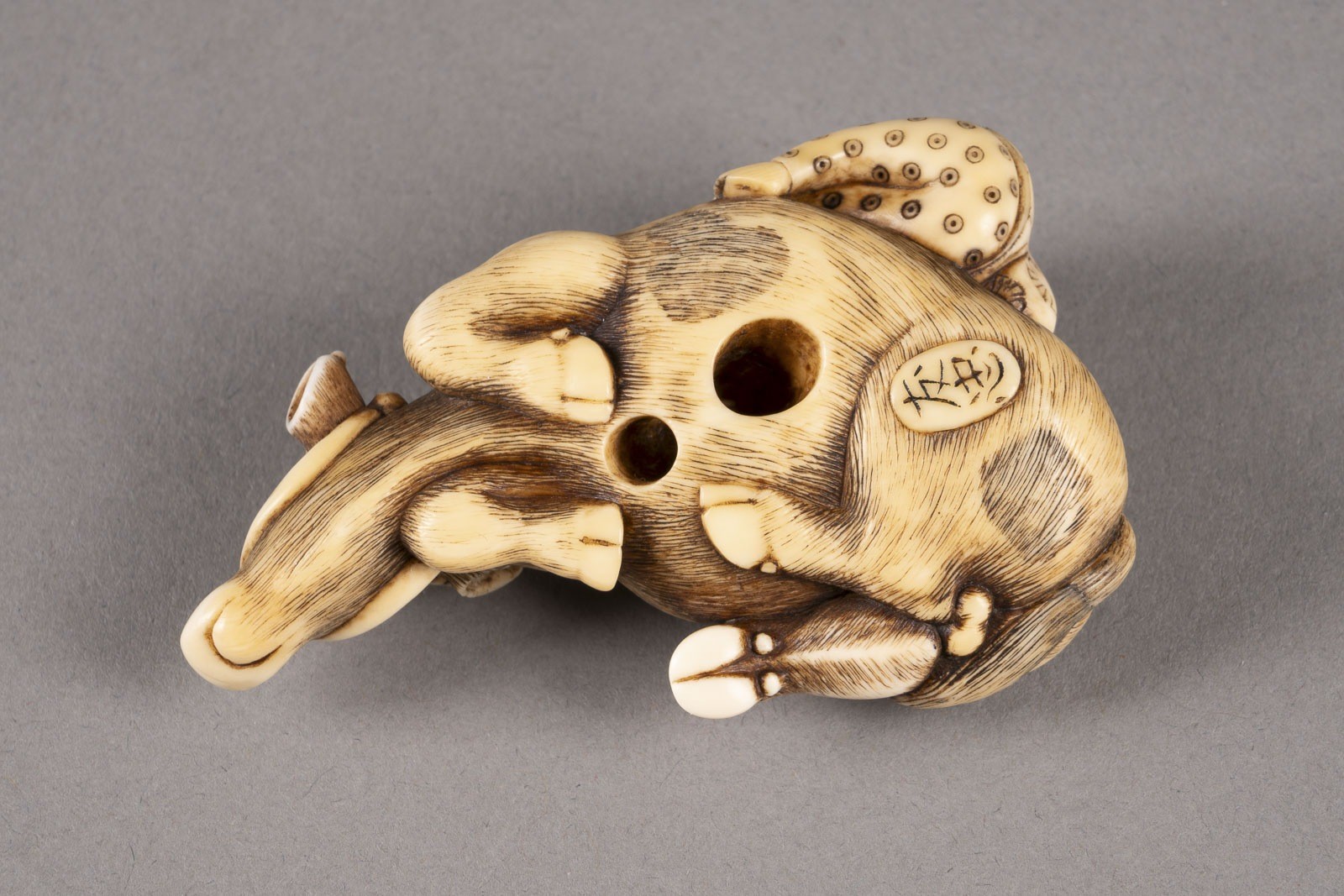AN IVORY NETSUKE OF A RECLINING OX WITH A BOY Japan, 18th/19th century Ivory. L. 6.3 cm. The netsuke is finely carved as a reclining ox with a boy climbing on its back. The base signed 'Tomotada', carved by Garaku. With traces of age and use, partially cracked. CITES marketing certificate is available.Please note that due to the current CITES regulations for ivory and tortoiseshell objects, unrestricted trade is only permitted within the European Community.