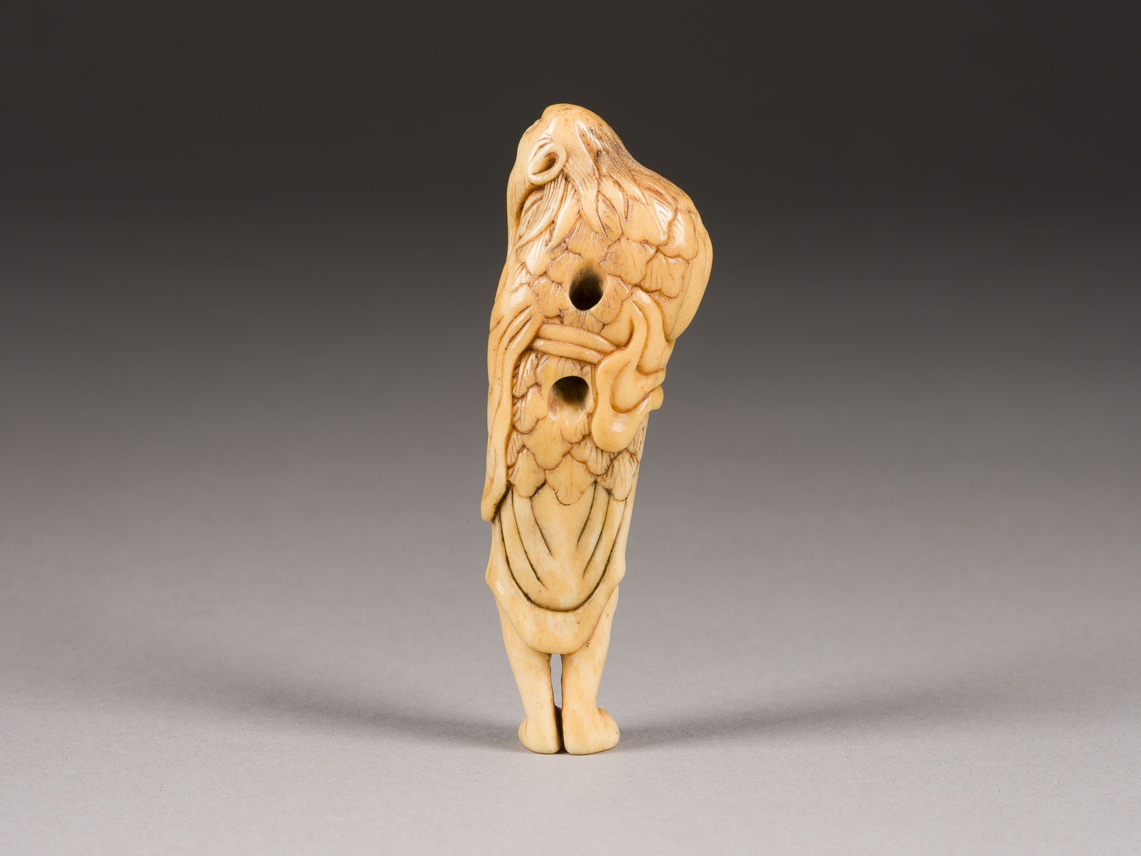 A STAG-ANTLER NETSUKE OF A SENNIN Japan, 18th/19th century Stag-antler. H. 9.5 cm. The netsuke is carved as a sennin standing in a loosely belted robe, with leaf decorations on the back, holding a strand of hair in the right hand and a staff in the left. The head is tilted upward to the left, with wide-open eyes and an open mouth. With traces of use and age, partially abraded and slightly cracked.