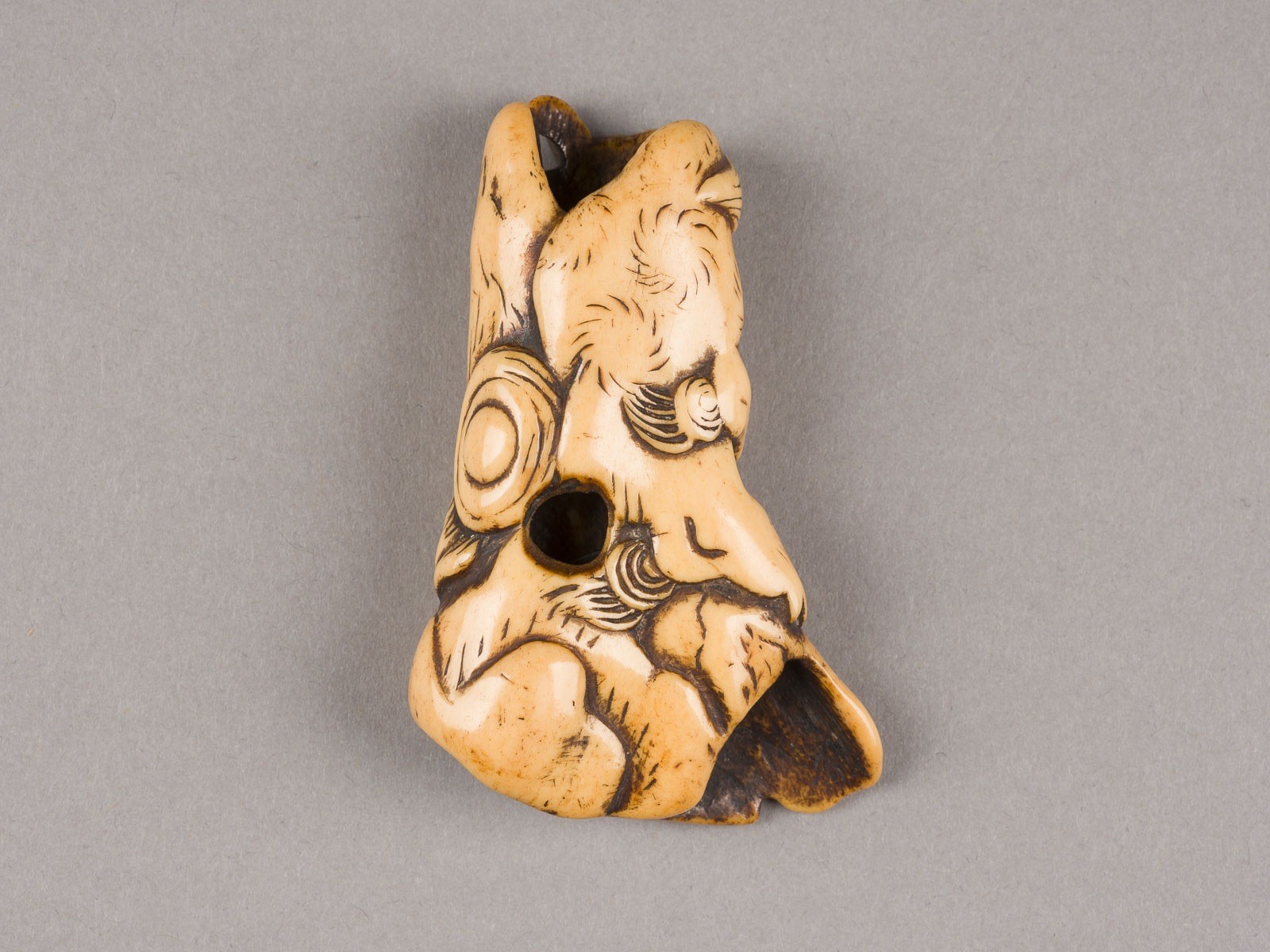 A STAG-ANTLER NETSUKE OF A SHISHI AND CUB Japan, 18th/19th century Stag-antler. H. 7.3 cm. The netsuke is carved as an adult shishi with a ferocious expression crouching atop a rock, beneath which a cub rests its forebody on the rock, gazing up at the adult lion. A coin is set within the openwork section at the center of the netsuke. With traces of use and age, partially abraded.