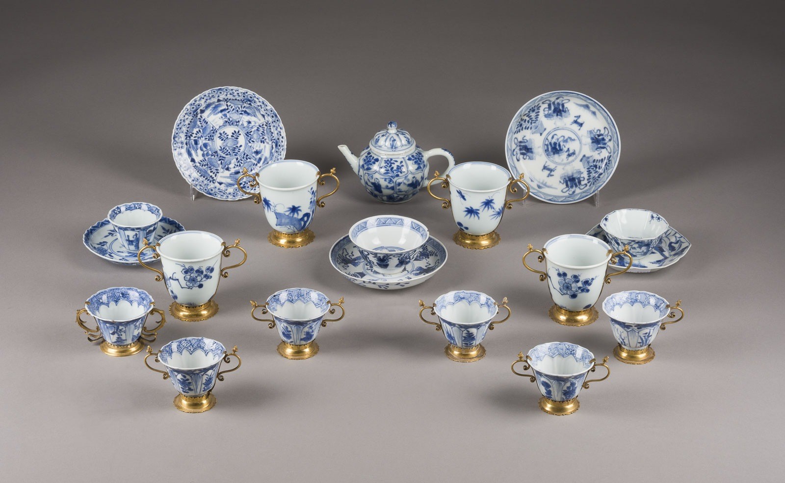 A GROUP OF NINETEEN BLUE AND WHITE PORCELAIN PIECES China, Qing Dynasty Porcelain. H. 3.7-9.1 cm; D. of sauers ca. 11.2-13 cm. Including thirteen cups, ten ormolu-mounted; five saucers; and a teapot. In total, five pieces with marks. With traces of age and use, partially chipped and cracked.