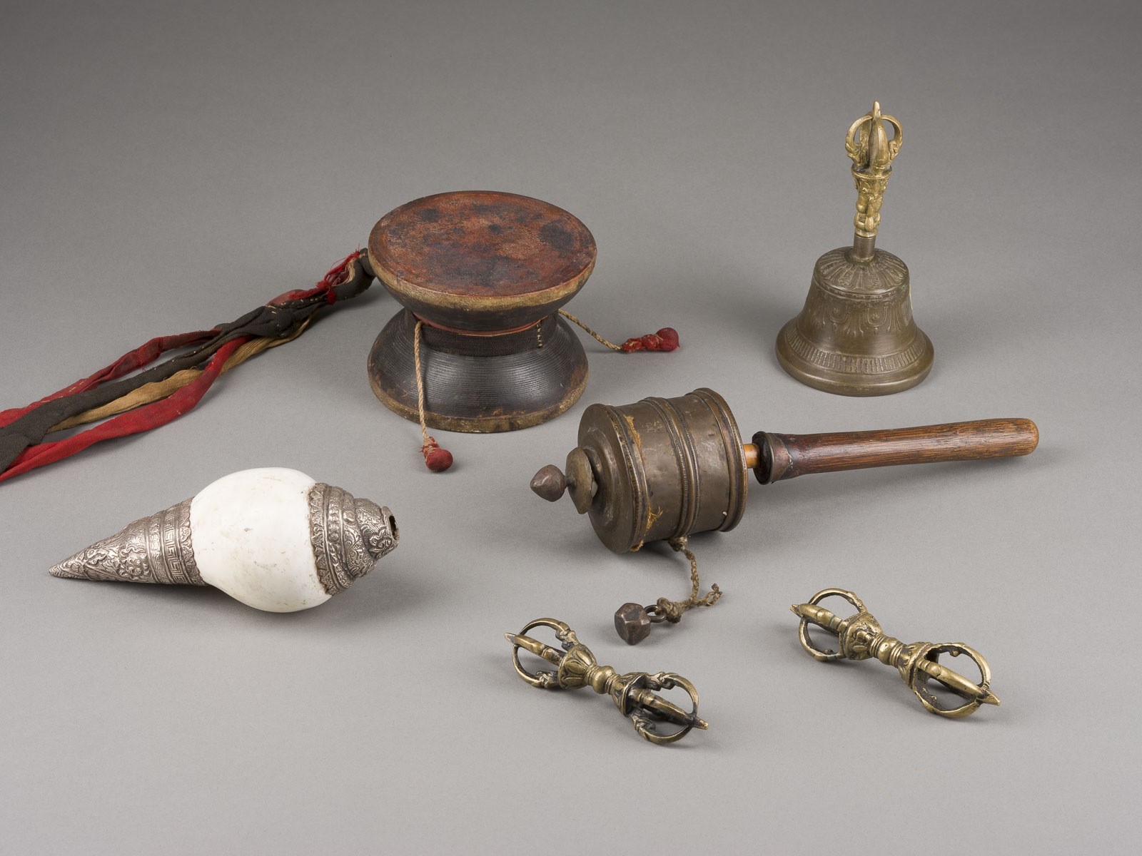 A GROUP OF SIX TIBETAN RITUAL OBJECTS Tibet, 19th/20th century Wood/Bronze/Shell, etc.. H. 9-30.5 cm. Including a wooden ritual drum (damaru), two vajras, a ghanta, a conch shell (shankha) horn, and a mani khorlo (prayer wheel). With traces of use and age, partially abraded and damaged.