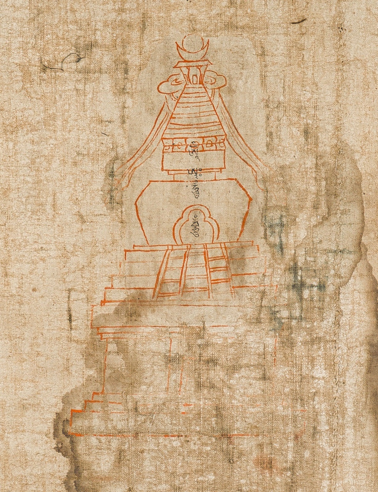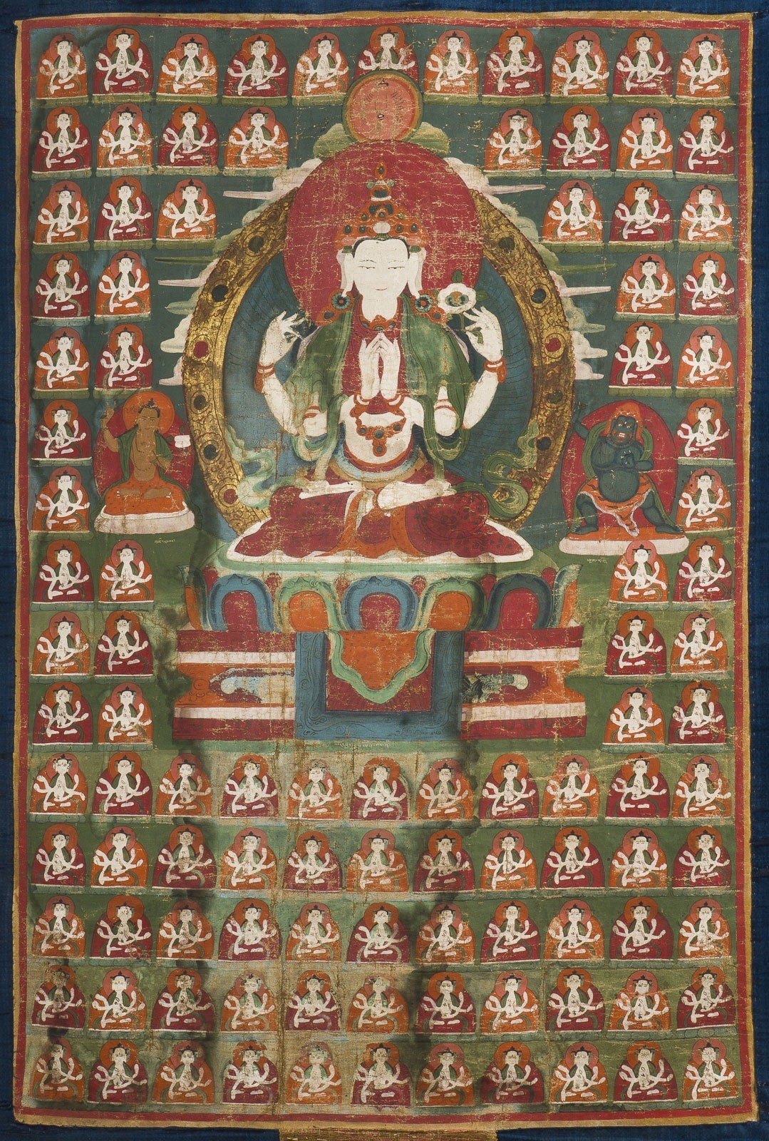 A THANGKA DEPICTING SHADAKSHARI LOKESHVARA Nepal, 18th/19th century Distemper on cloth, mounted. Ca. 69x46.5 cm (ca. 115x60 cm with mounting). The thangka depicts the Shadakshari Lokeshvara as its central figure. A golden mandorla studded with jewels encircles him, while his head is surrounded by a red aureole. He wears an elaborate jeweled crown, atop which sits Amit?bha. To his right stands the Bodhisattva Manjushri, and to his left, the Bodhisattva Vajrapani. They are surrounded by 104 attendant figures. In the background, a red stupa and inscriptions in Tibetan script are depicted. With traces of age, partially damaged and stained. Literature: An article by Gregor Verhufen, Tibetologist and religious scientist at the University of Bonn.