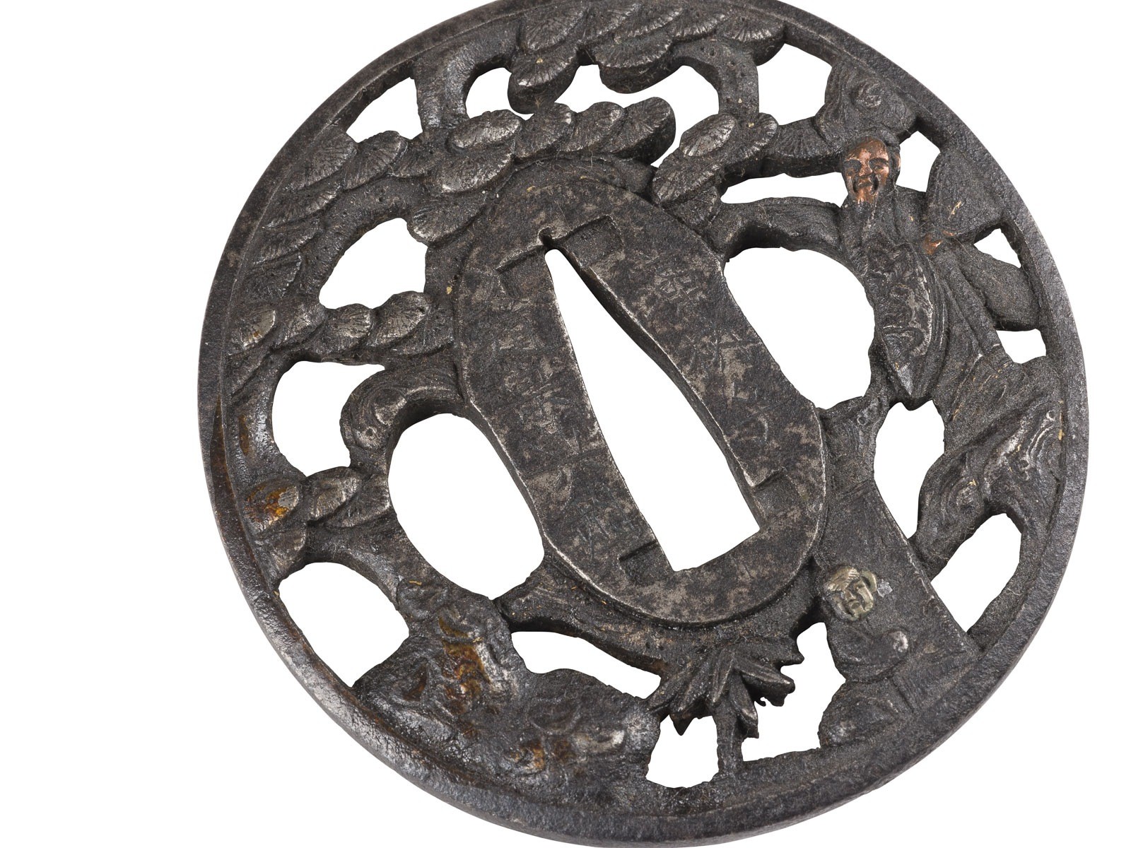 AN IRON TSUBA (SWORD GUARDS) Japan, 18th/19th century Iron. H. 7.5 cm. The tsuba is of marugata shape, finely worked in sukashi, and signed "Goshu Hikone Ju, Mogarashi Nyudo Soten Sei". With traces of age. Provenance: From an old private collection in North Rhine-Westphalia.