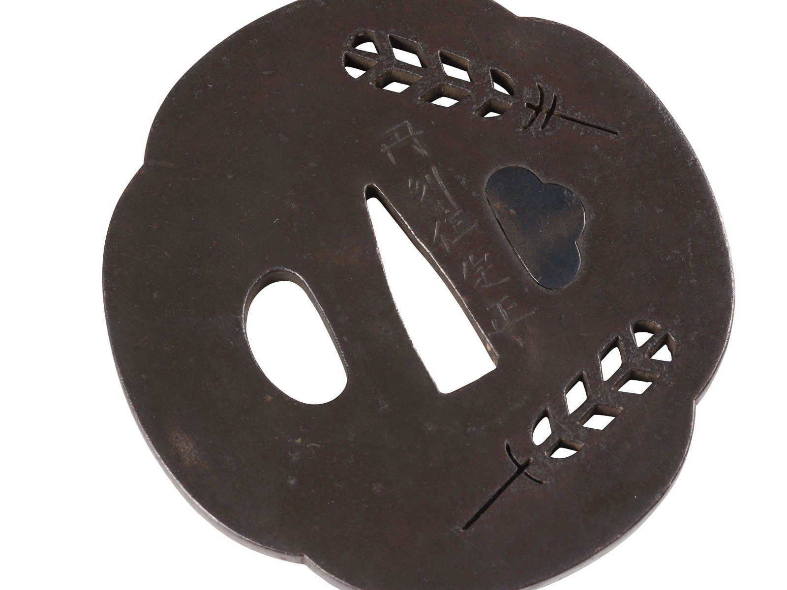 AN IRON TSUBA (SWORD GUARDS) Japan, 18th/19th century Iron. H. 7.7 cm. The tsuba is of mokkogata shape, signed "Tanshu-ju Sadamasa". With traces of age. Provenance: From an old private collection in North Rhine-Westphalia.