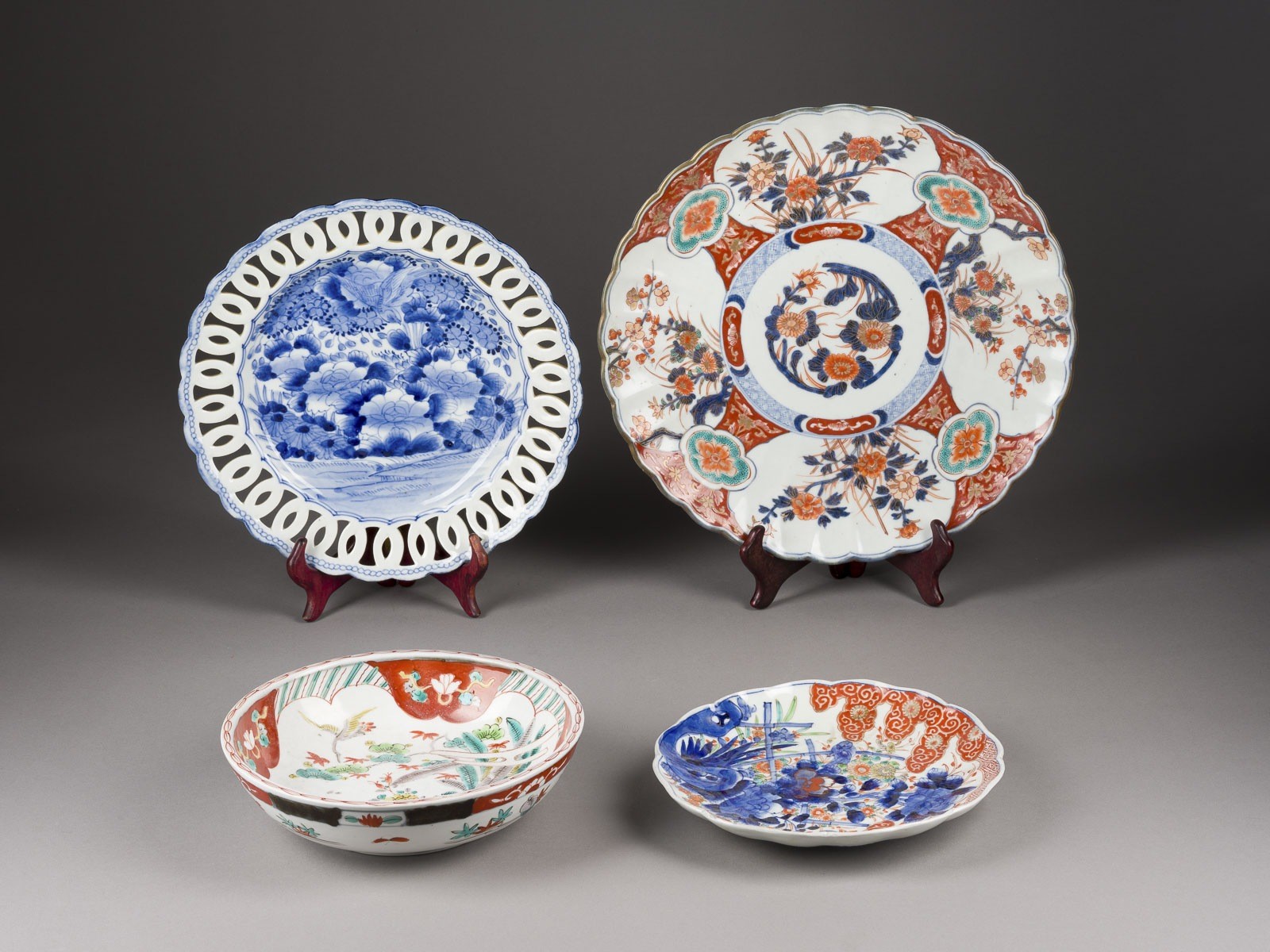 A GROUP OF FOUR VARIOUS 'FLORAL' DISHES Japan, 19th/20th century D. 21.5-32 cm. Porcelain. With traces of use; partially abraded; one with chips to the base rim.