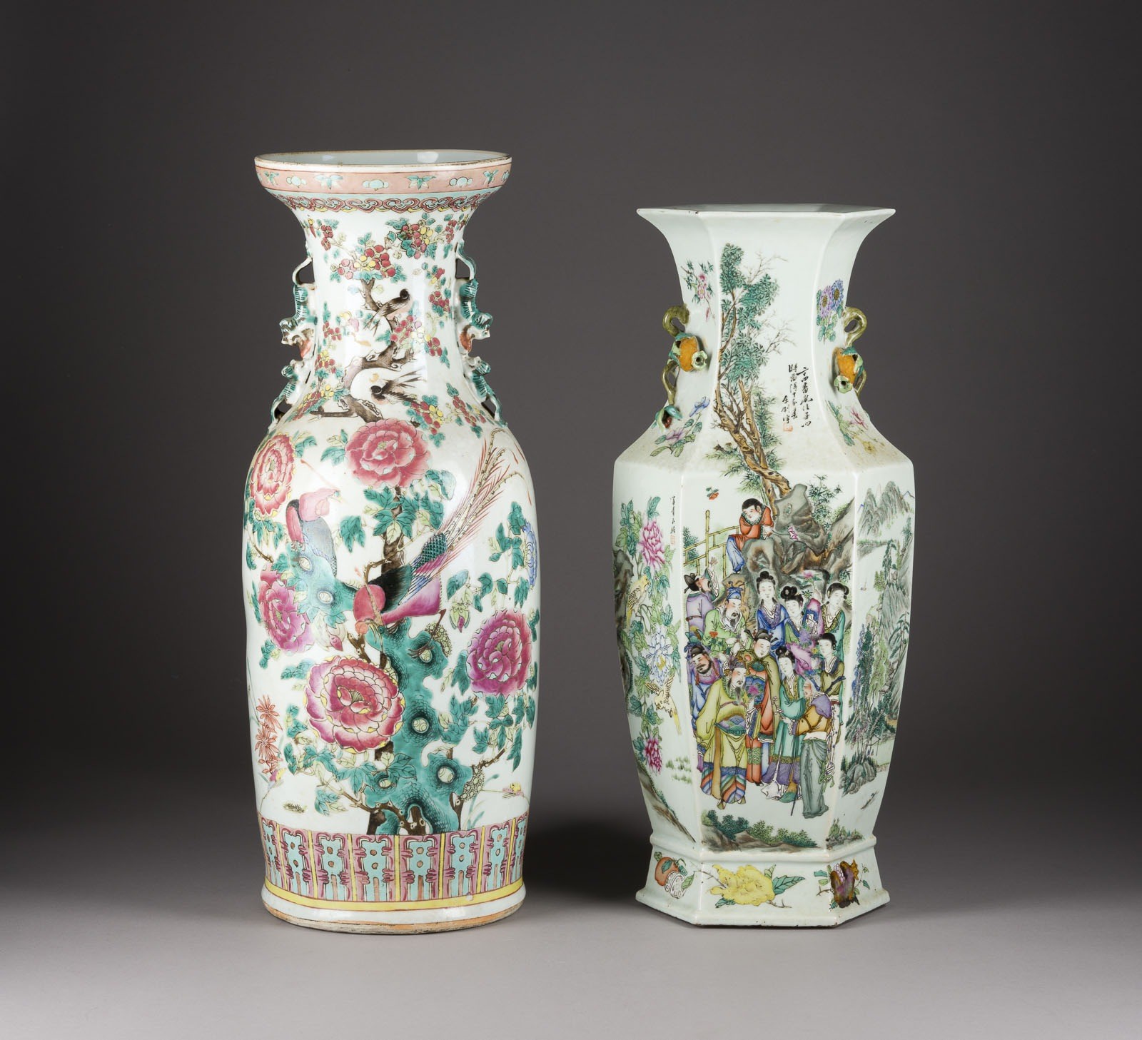 A GROUP OF FOUR FAMILLE-ROSE VASES China, early 20th century Porcelain. H. 56.5-60.5 cm. Including a vase decorated with figure scenes, a vase decorated with flowers and birds, and two vases decorated with 'antiques'. With traces of use and age, partially abraded, one with a minor chip to the rim, one with cracks on the base.
