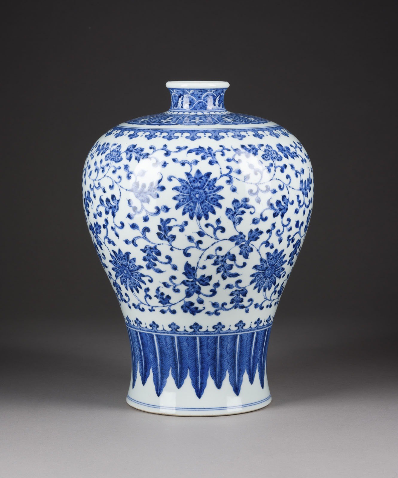 A BLUE AND WHITE MEIPING-VASE China Porcelain. H. 33.2 cm. The vase is decorated with lotus flowers. With traces of use.