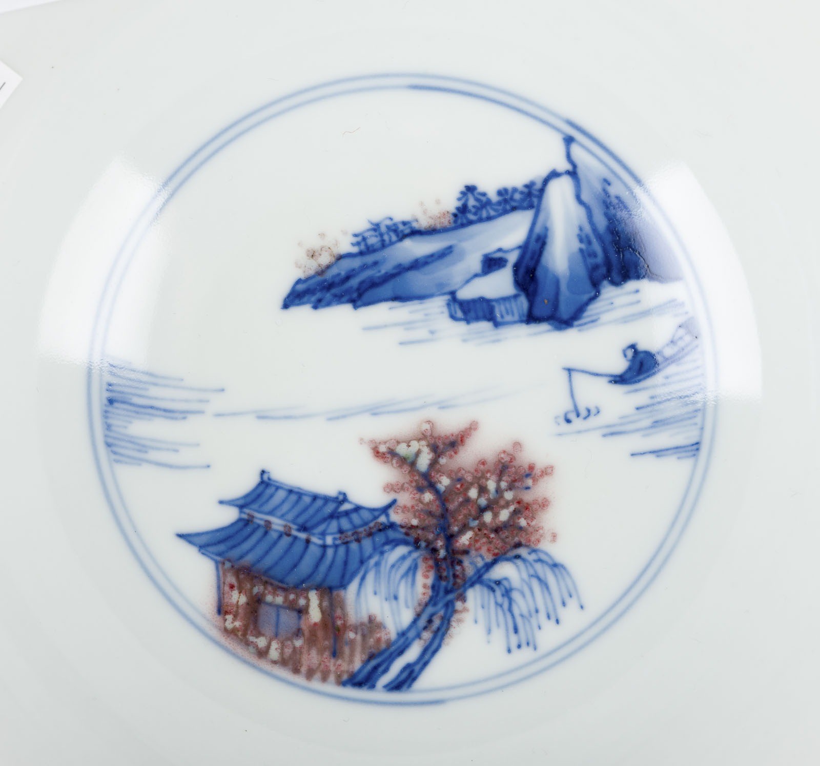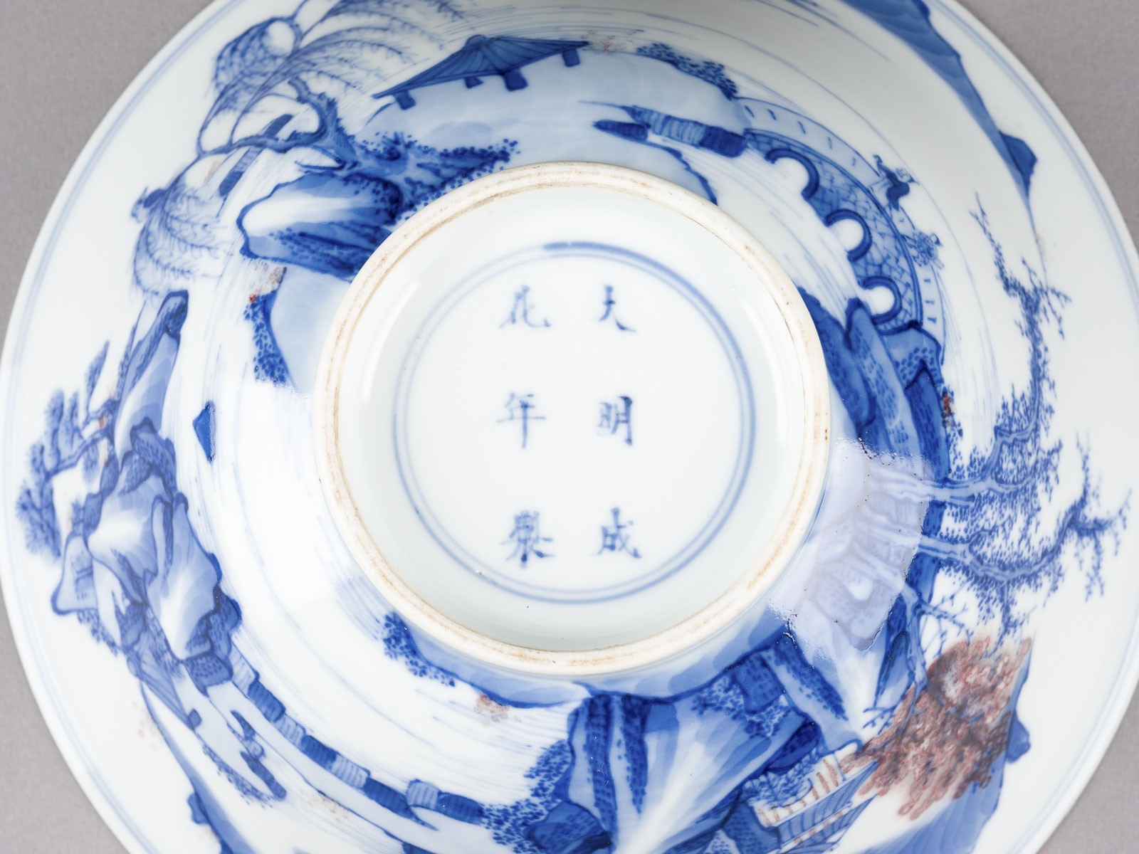 A BLUD AND WHITE COPPER RED-DECORATED 'LANDSCAPE' BOWL China Porcelain. H. 7.7 cm. The bowl is decorated on the exterior and on the center of the interior with landscape scenes. With a mark "Da Ming Chenghua Nian Zhi" on the base. With traces of age and use, partially chipped on the rim.