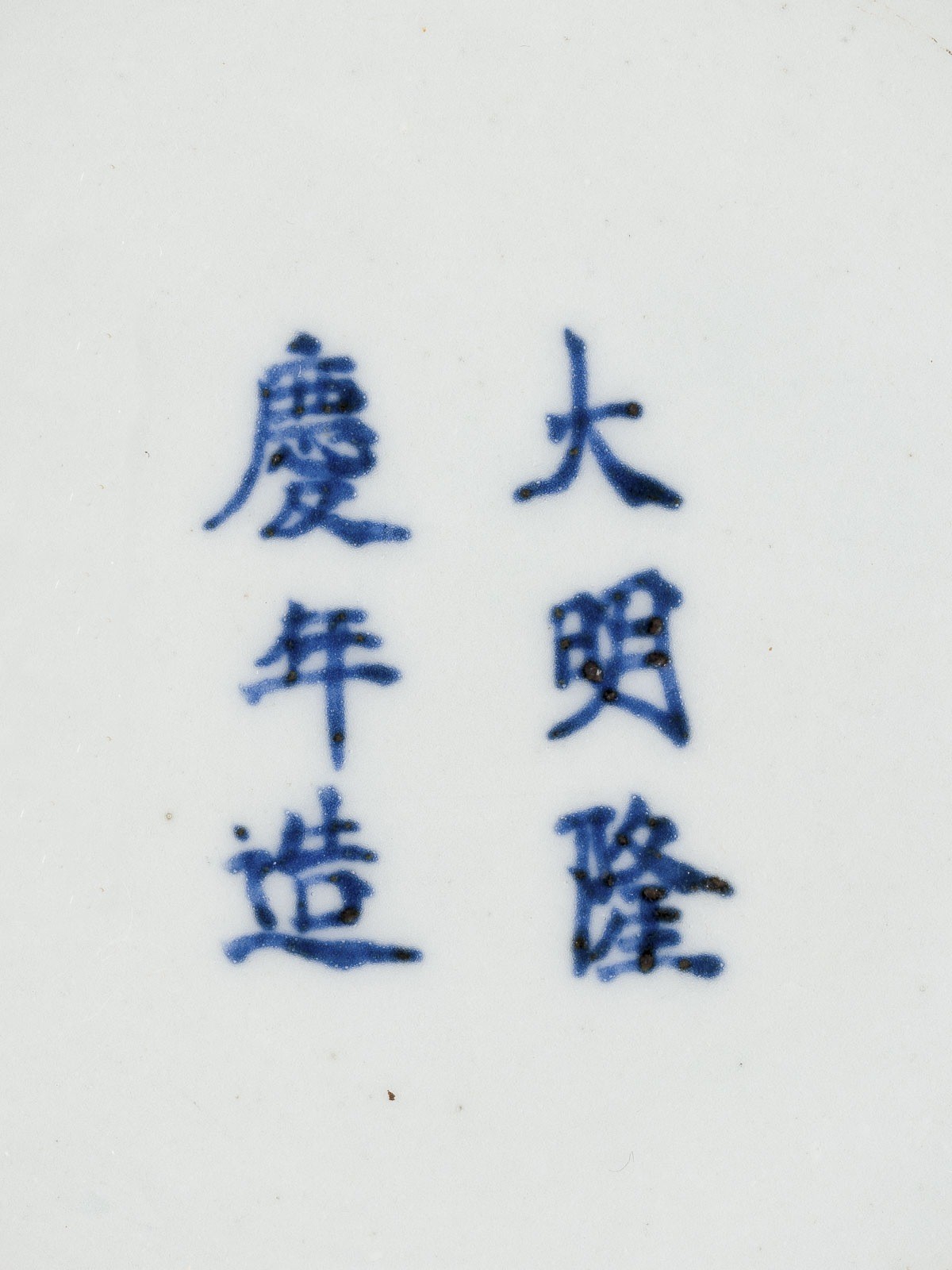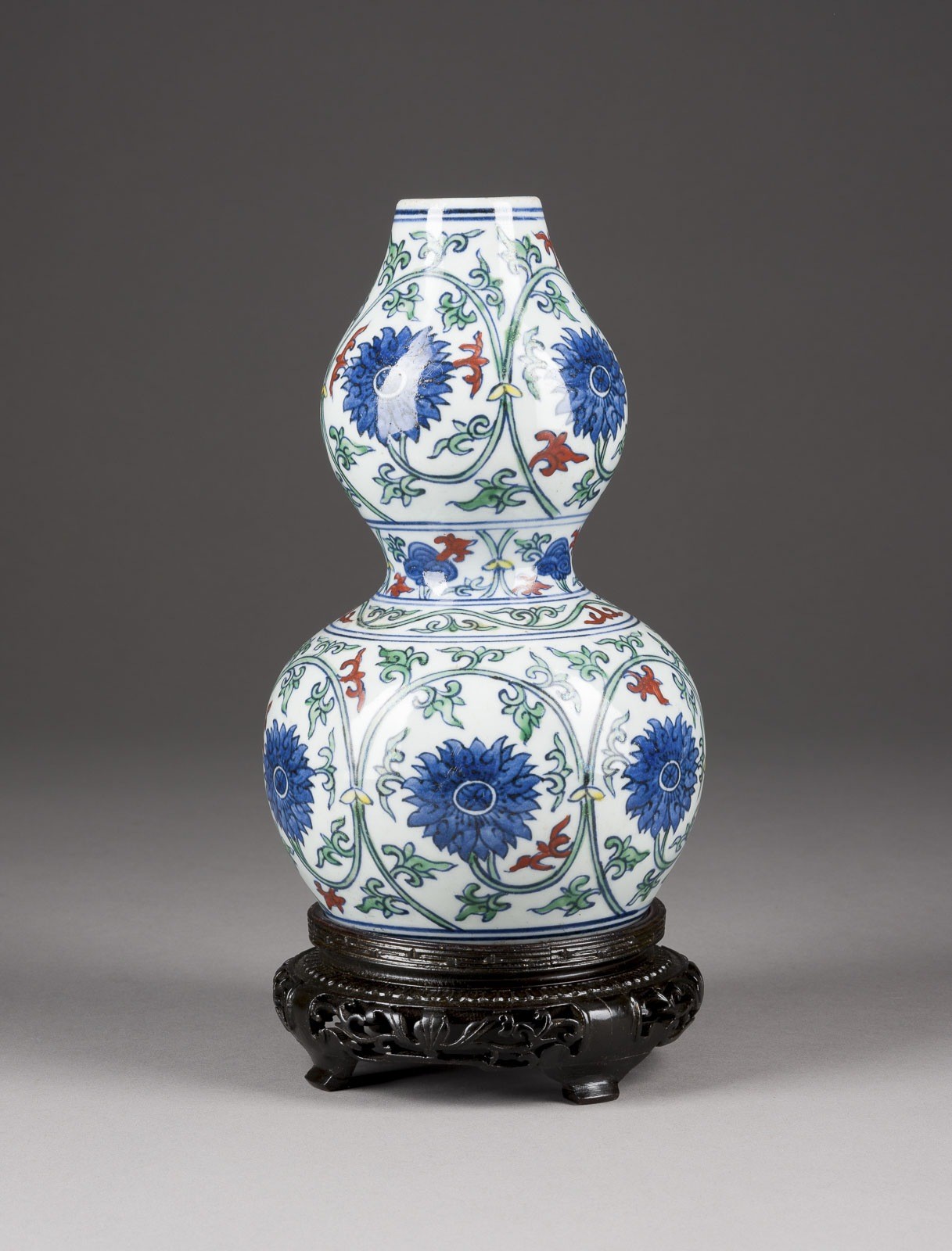 A DOUCAI DOUBLE-GOURD VASE China Porcelain. H. 22 cm. With a mark "Daming Longqing Nianzao" on the base. With traces of use, partially abraded.