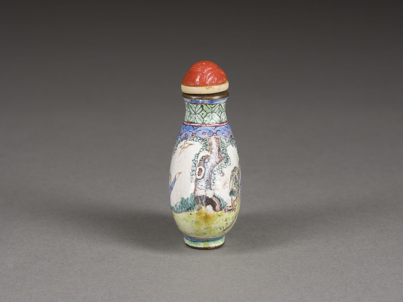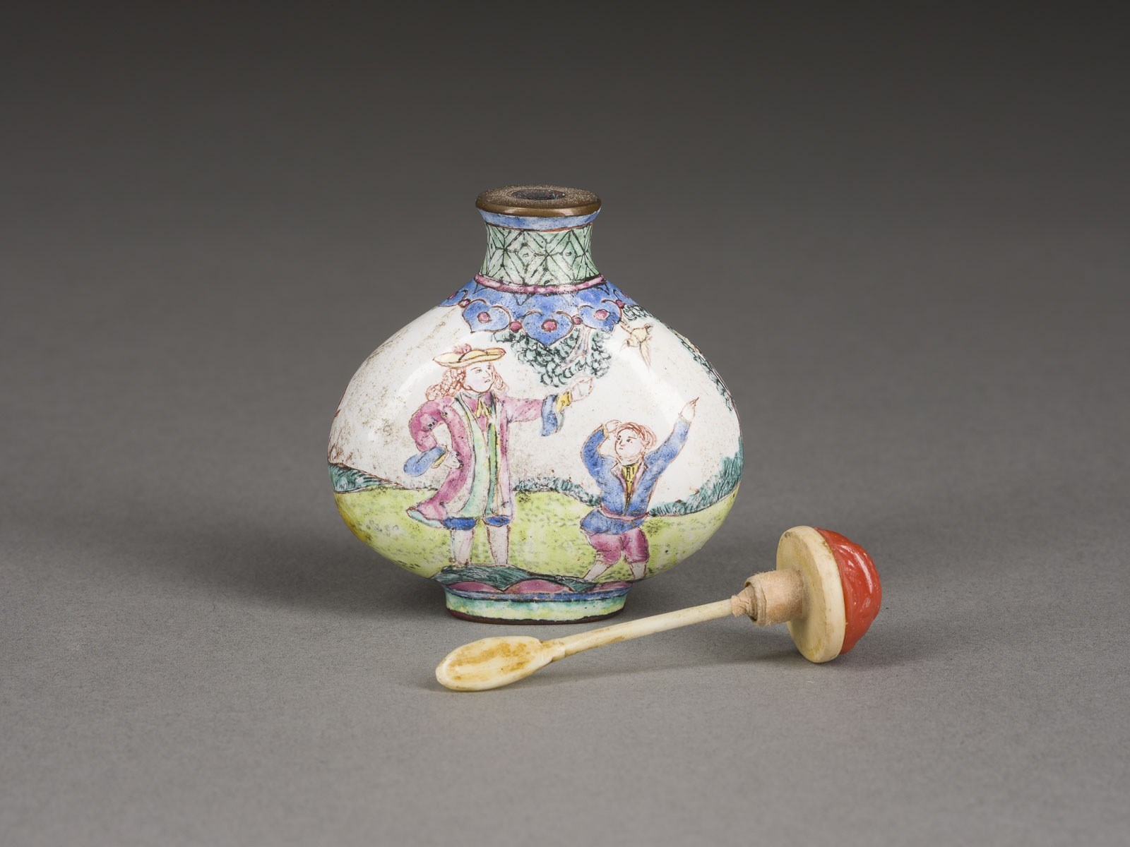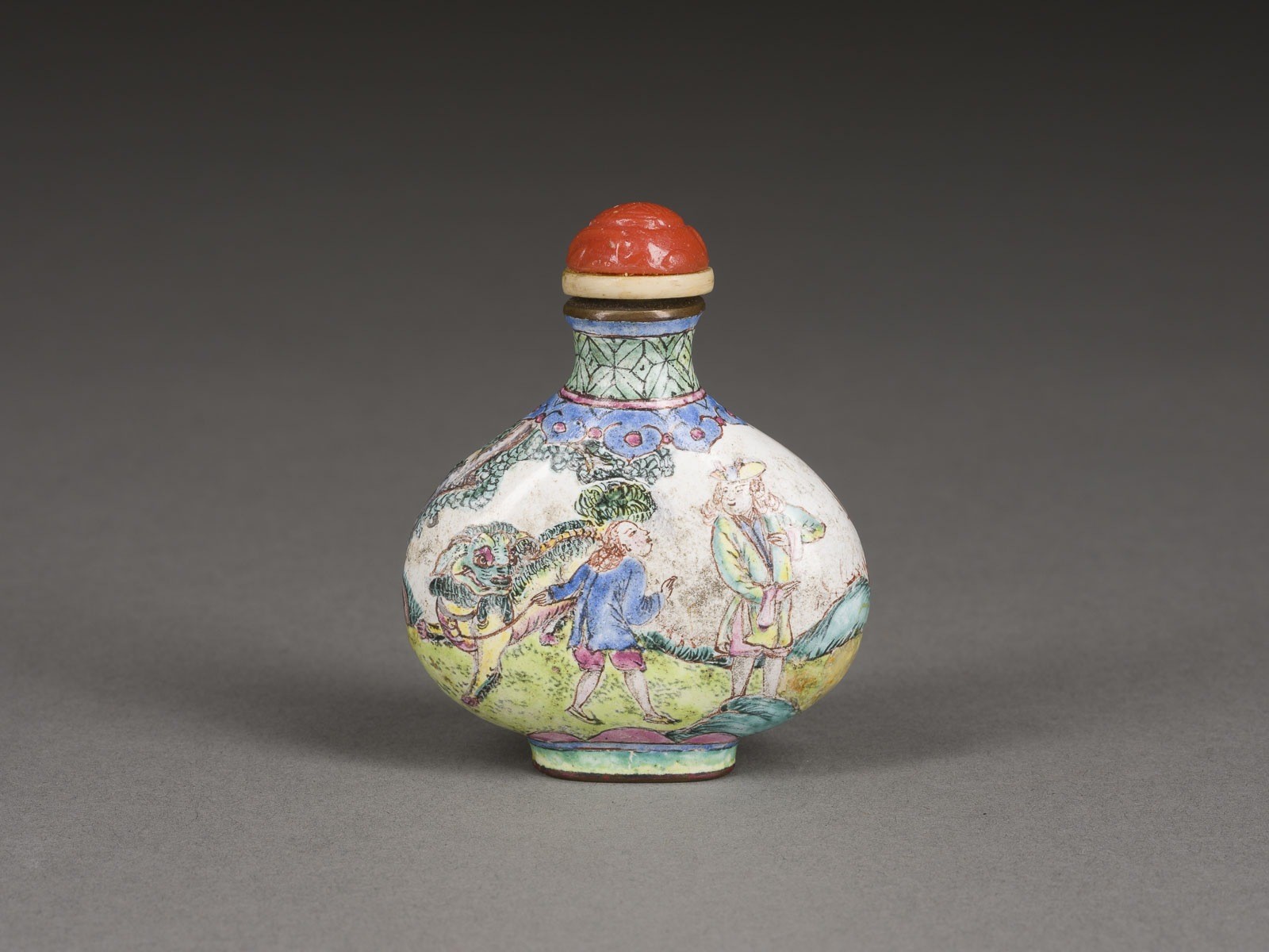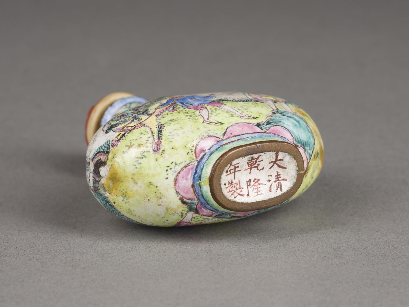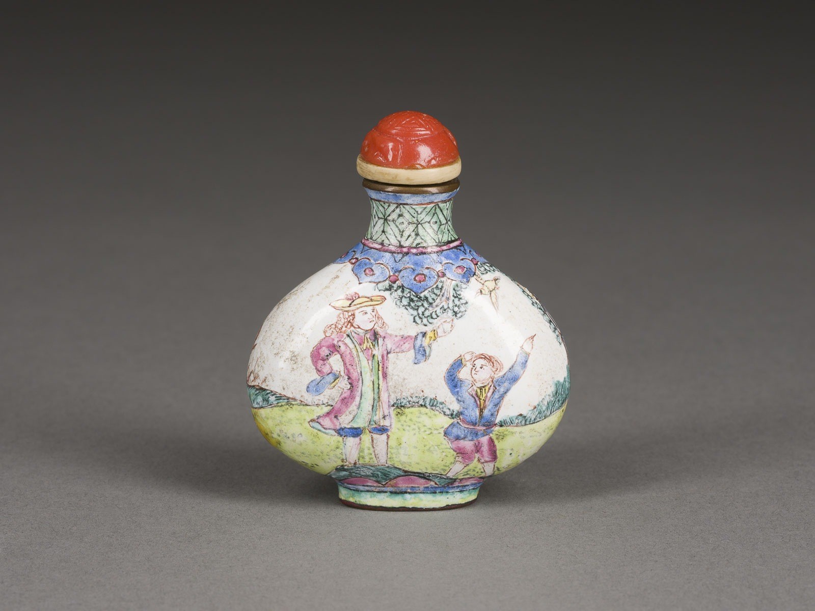 A PAINTED ENAMEL 'EUROPEAN SUBJECT' SNUFF BOTTLE China, Qing Dynasty H. 5.9 cm. Copper alloy. The snuff bottle is finely painted, delicately depicting European figures on each side. The base bears a six-character mark "Da Qing Qianlong Nian Zhi". With traces of use and age, partially damaged and stained, and with areas of restoration. Provenance: From a private collection in North Rhine-Westphalia.