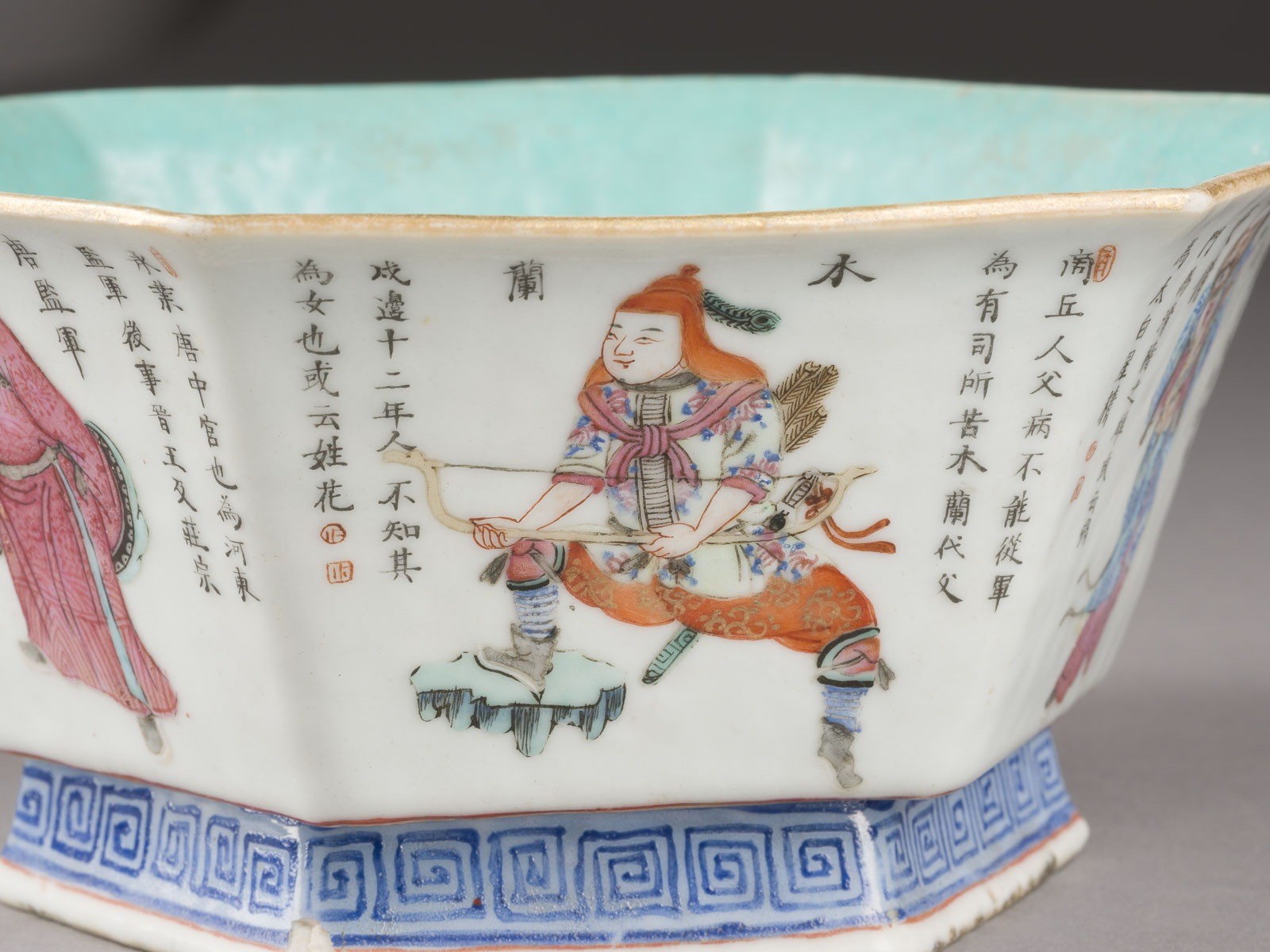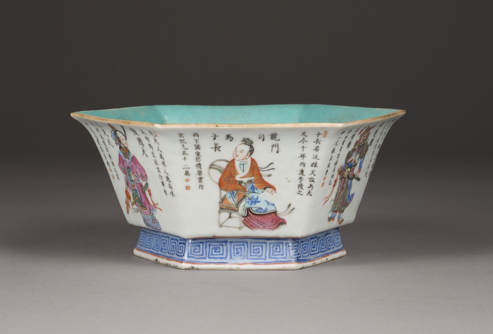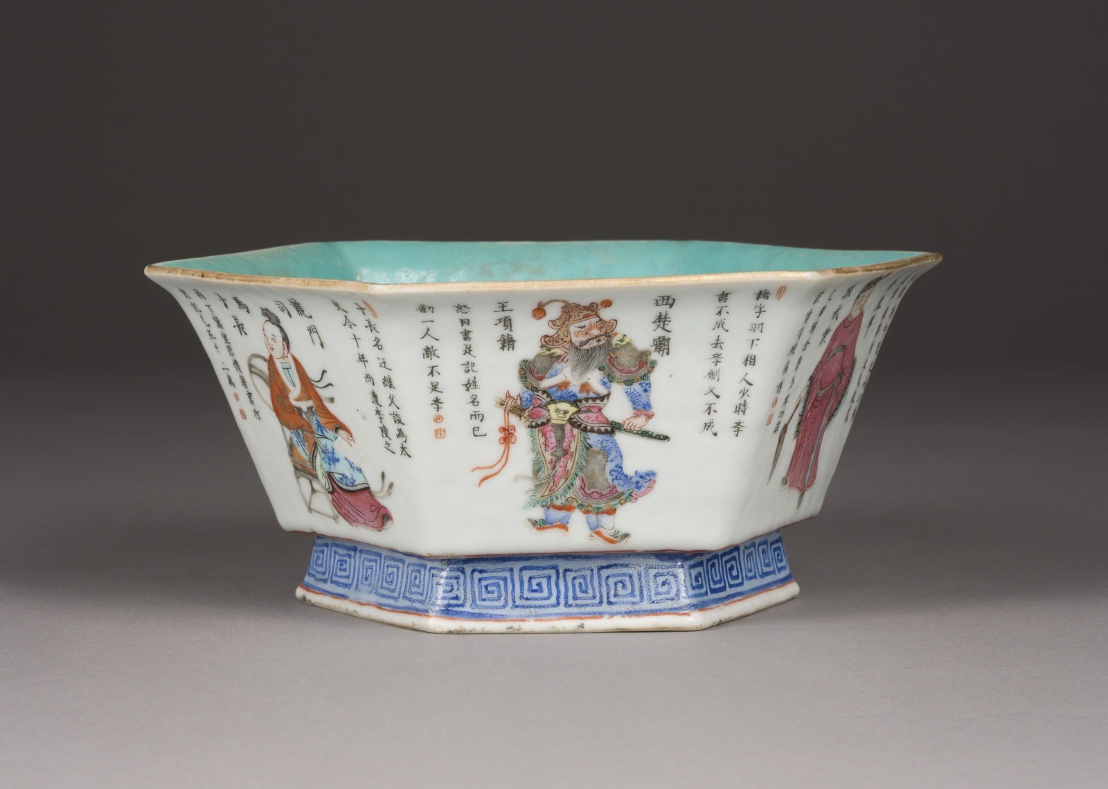 A FAMILLE ROSE 'WU SHUANG PU' BOWL China, Qing Dynasty Porcelain. H. 8.5 cm. The hexagonal bowl is decorated on the exterior with various figures from the Wu Shuang Pu (Table of Peerless Heroes), each figure is accompanied by an inscription identifying the character. The interior is covered with turquoise enamel, with an iron-red six-character mark "Da Qing Tongzhi Nianzhi". With traces of age and use, partially abraded, and with an area of chip to the rim at the foot.