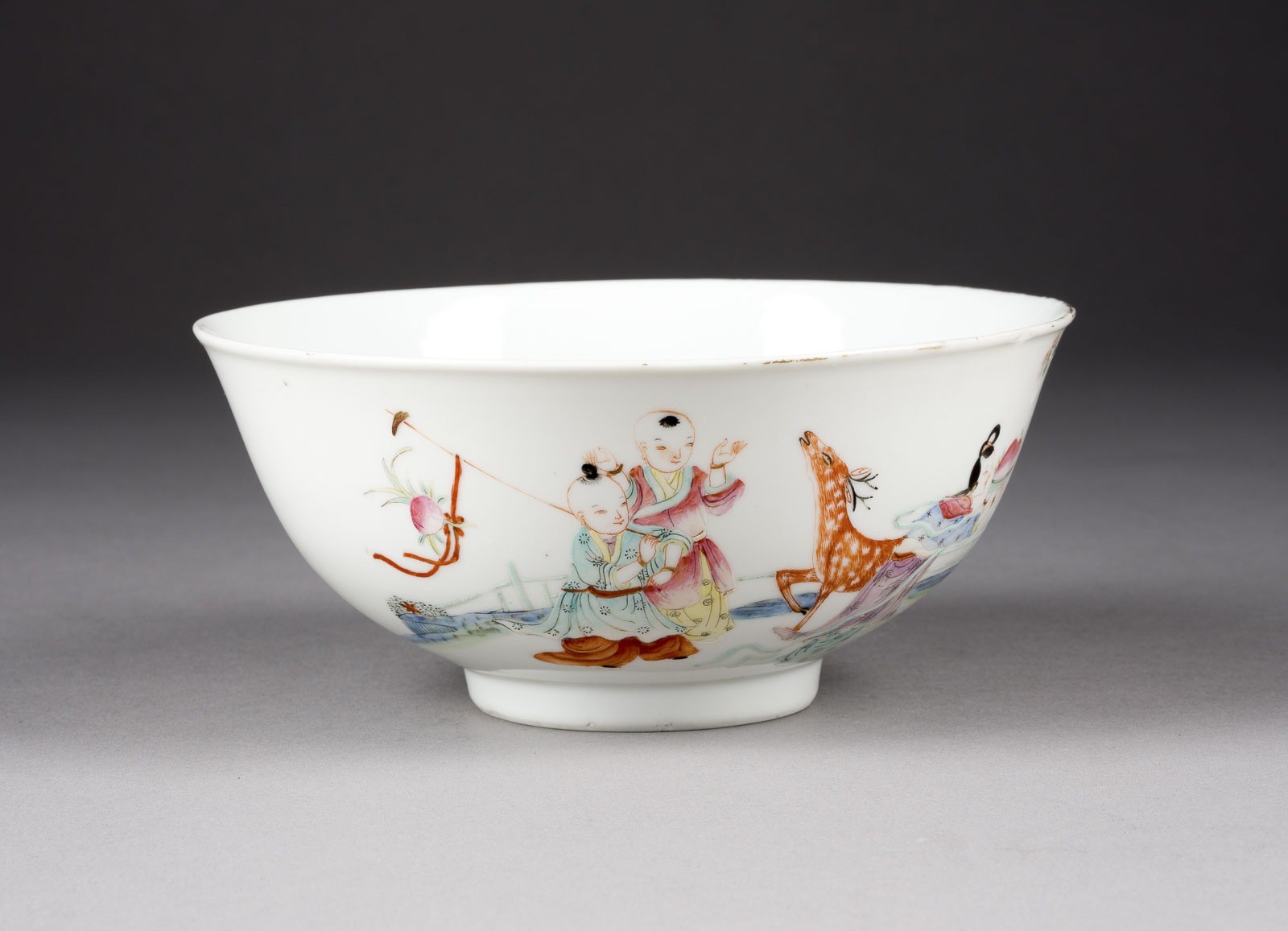 A FAMILLE ROSE 'FIGURAL' BOWL China, Qing Dynasty Porcelain. H. 7.4 cm. The bowl is decorated on the exterior with the scene of "Ma Gu Xian Shou", while on the center of the interior, a man is depicted leaning against a large damaged vase. The base bears a mark "Qianlong Nianzhi". With traces of age and use, and a minor chip to the rim.