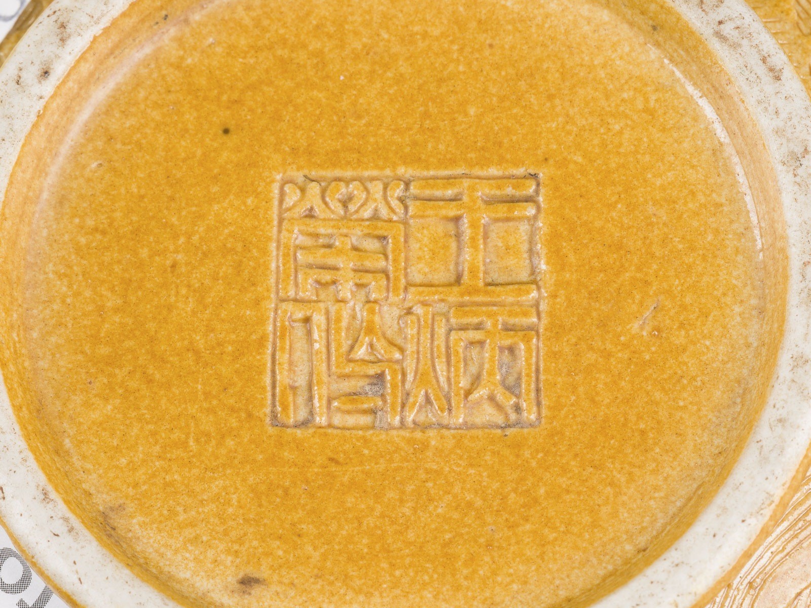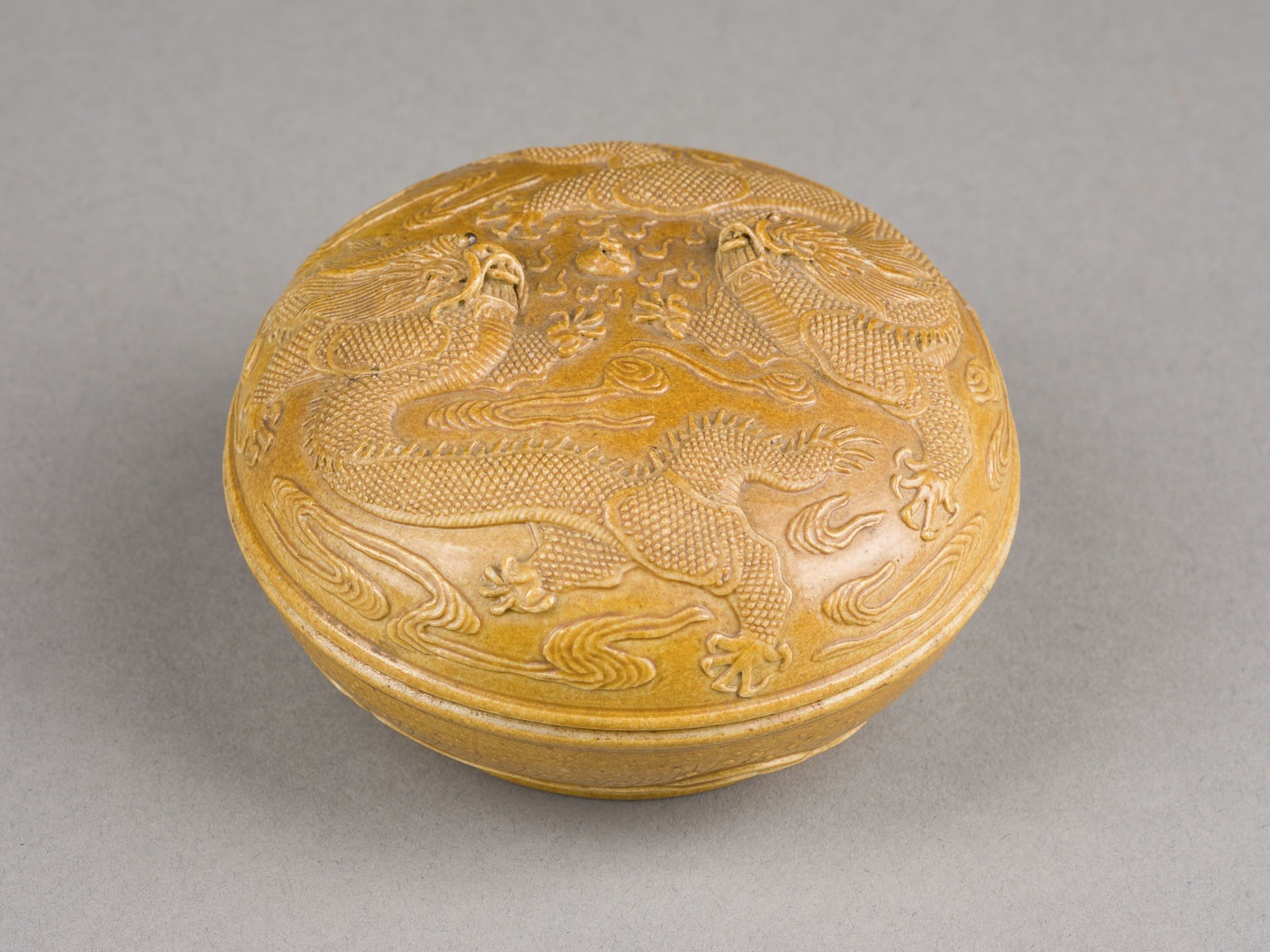 EINE GELBGLASIERTE RELIEFDEKORIERTE DECKELDOSE MIT DRACHENDARSTELLUNG