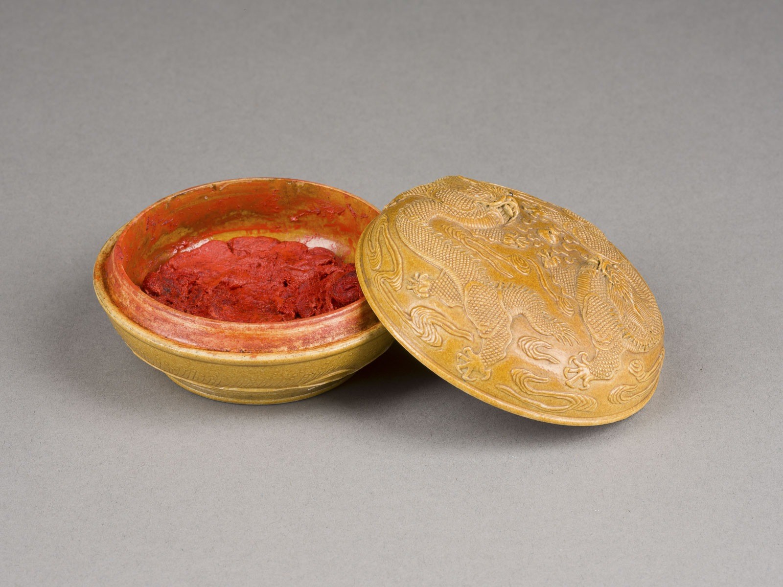 A YELLOW-GLAZED CARVED AND MOULDED 'DRAGON' SEAL BOX AND COVER China, 19th century Porcelain. D. 8.3 cm. The cover is finely carved in high relief with two five-clawed dragons chasing a flaming pearl amidst swirling clouds. The base is carved in relief with a "Wang Bingrong zuo (Made by Wang Bingrong)" mark. The interior contains remnants of red seal paste. With traces of age.