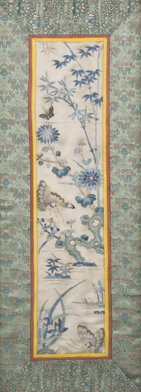 A FRAMED EMBROIDERY China, 20th century Embroidery. 46x19 cm. The embroidery depicts flowers, bamboo, and butterflies. With traces of use and age.