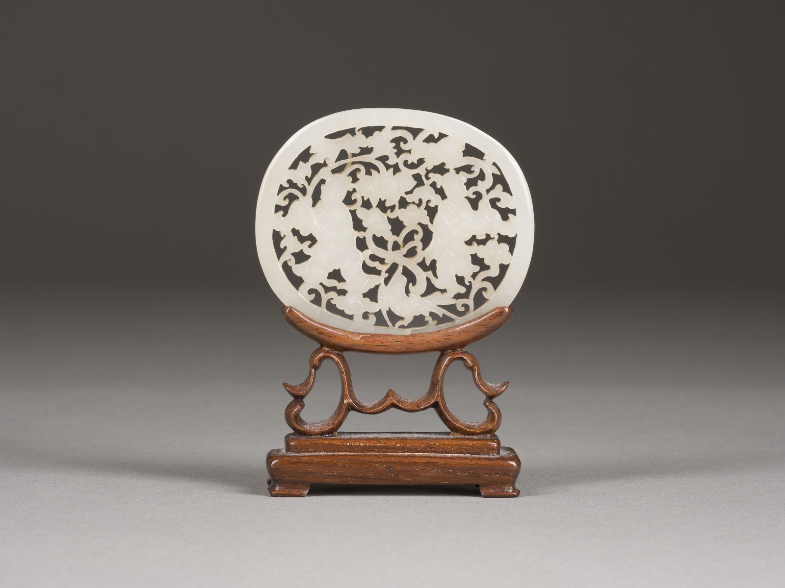 EINE GESCHNITZTE WEISSE JADEPLAKETTE MIT HOLZSTÄNDER