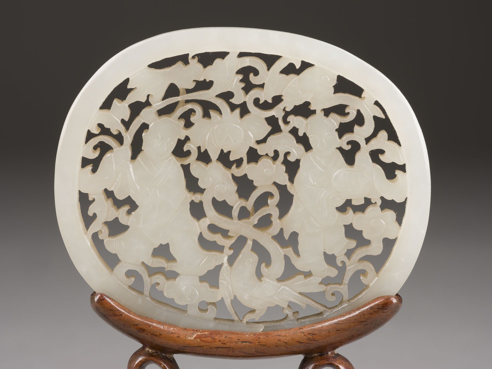 A CARVED WHITE JADE PLAQUE WITH WOODEN STAND China, 19th/20th century Jade. H. 5.8 cm (9.7 cm with stand). Finely carved with two boys. With traces of age, slightly cracked. Provenance: From a private collection in North Rhine-Westphalia.