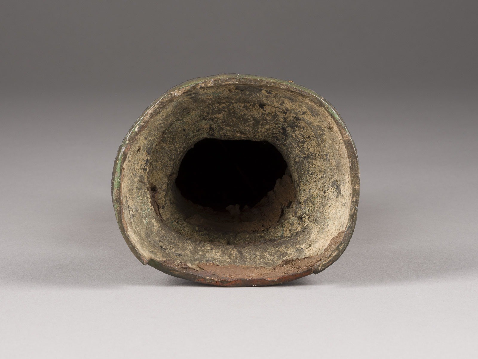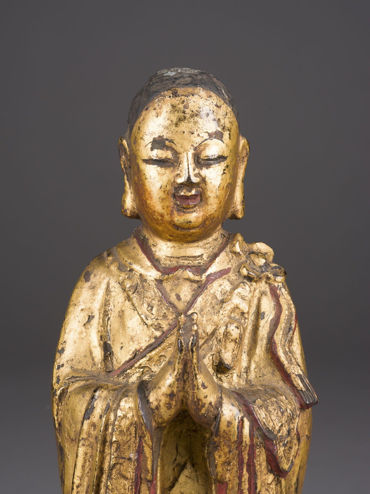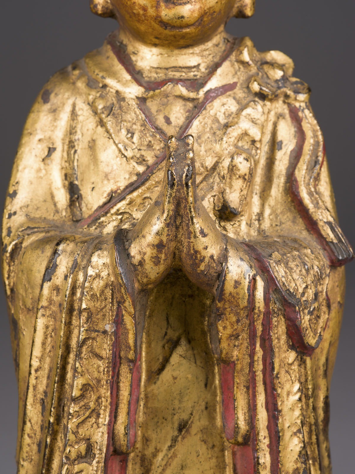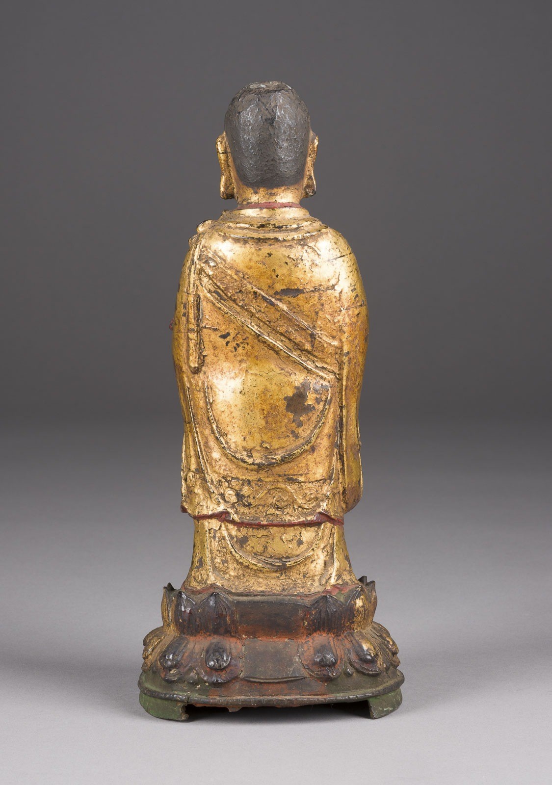 A GILT-LACQUERED BRONZE FIGURE OF LUOHAN ANANDA China, Ming Dynasty Bronze. H. 26.3 cm. The imposing arhat stands on a lotus pedestal, both hands joined in prayer, wearing a long flowing robe. With traces of age, partially damaged.
