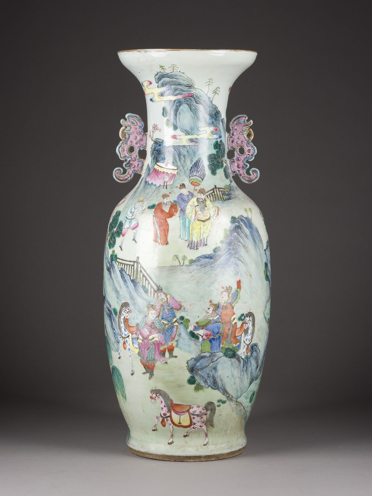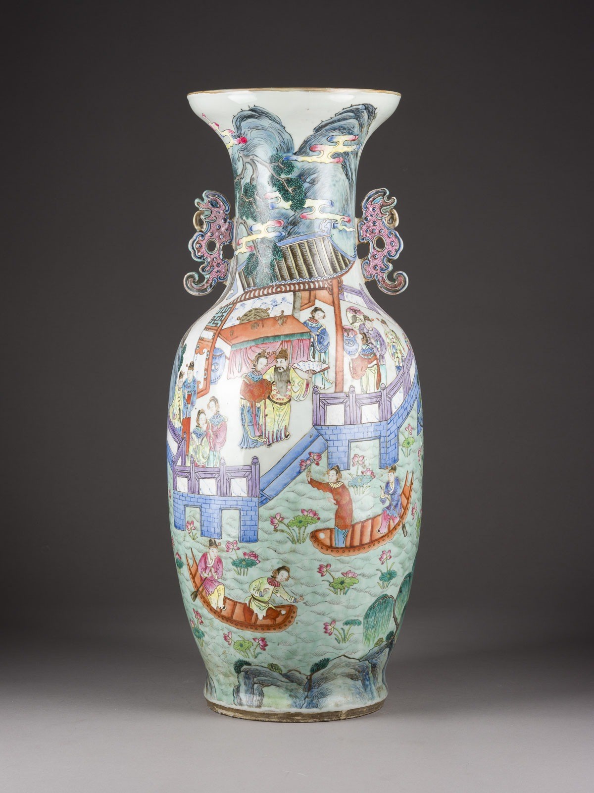 A LARGE FAMILLE-ROSE 'FIGURAL' VASE China, late Qing-Dynasty Porcelain. H. 62.5 cm. The vase is decorated with figure scenes. With traces of use and age, partially abraded, damaged and restored.