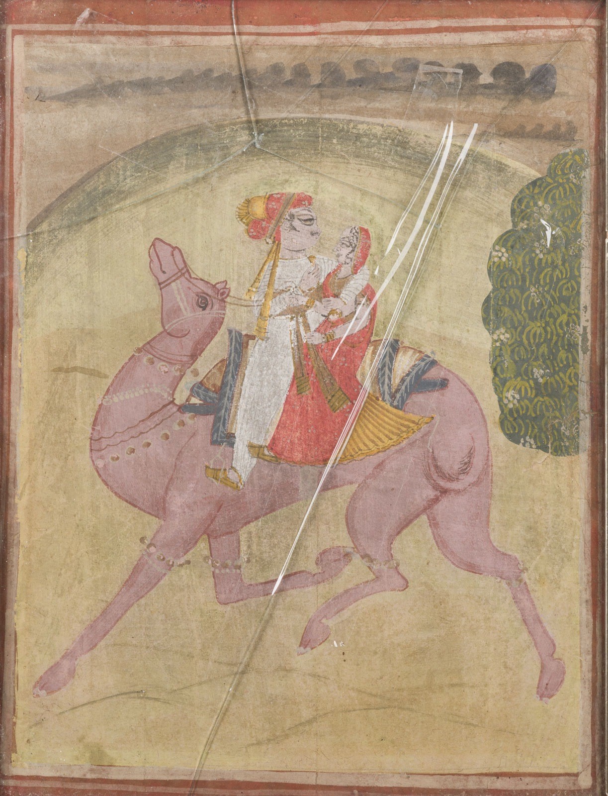 AN ILLUSTRATION FROM A RAGAMALA SERIES India Gouache on paper, framed and under glass. 35x27.3 cm with frame. With traces of age and loss of color, partially creased and stained; the glass of the frame is damaged.
