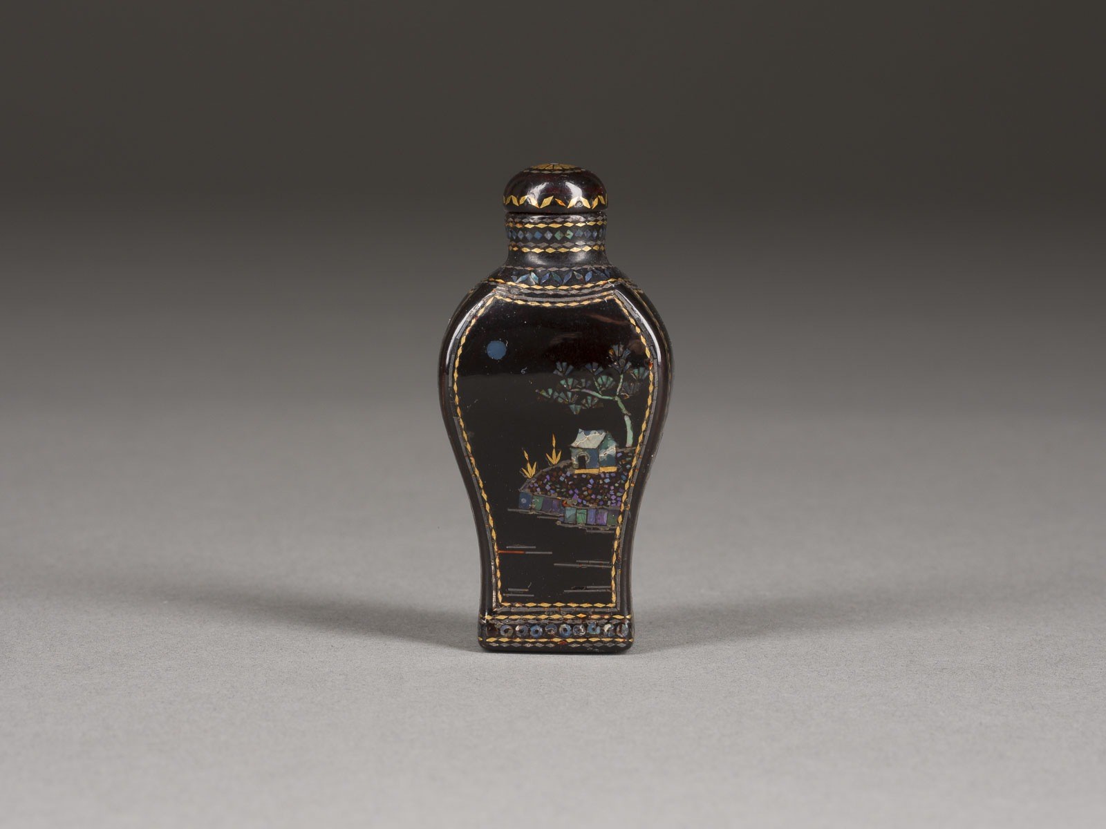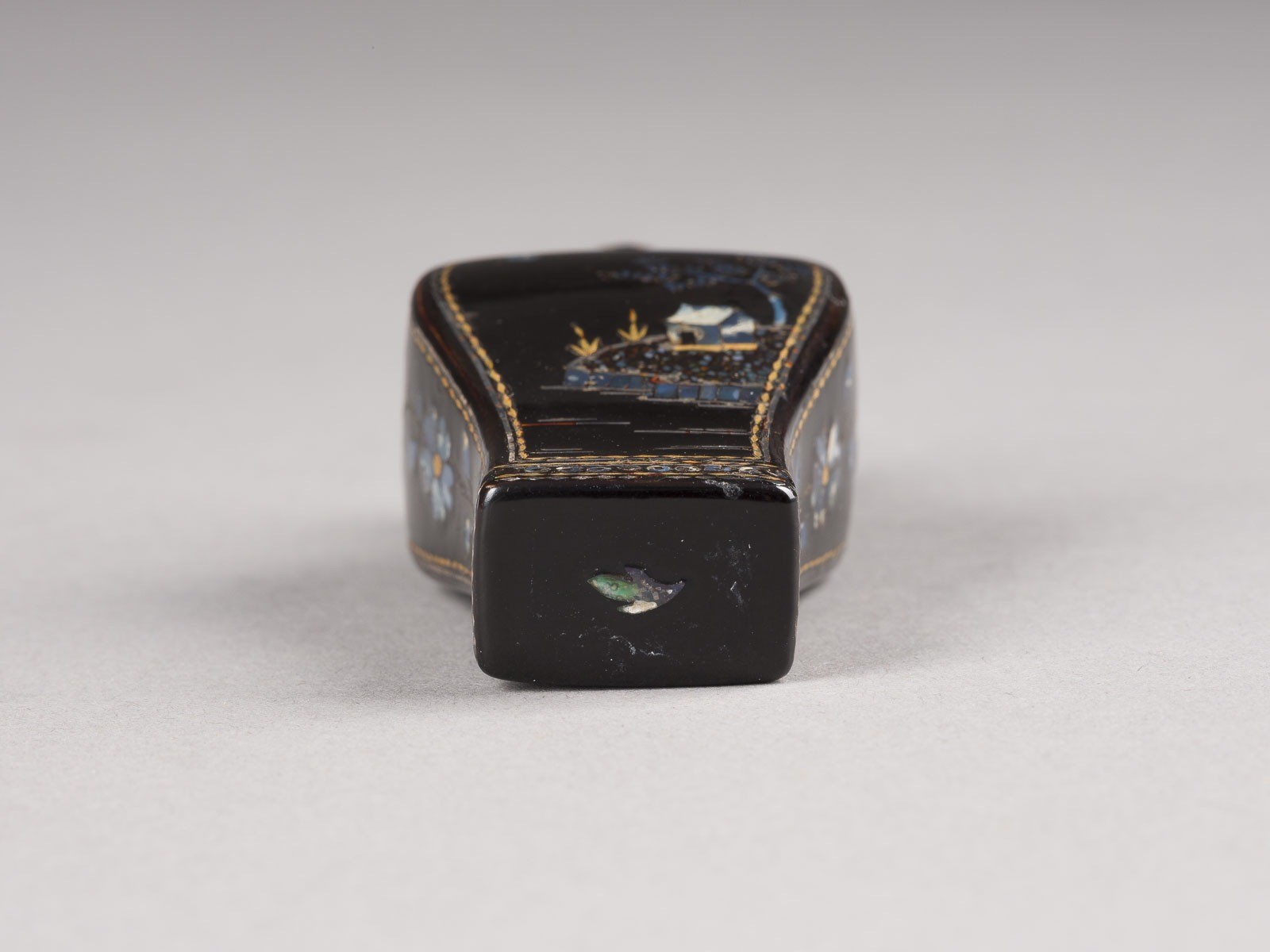 A JAPANESE LAC BURGAUTÉ SNUFF BOTTLE Japan, 19th century Lacqureware. H. 5.8 cm. The black-lacquered snuff bottle is finely decorated with a geometric pattern of inlaid shell and gold, with two wide sides depicting landscapes and two narrow sides with floral motifs. It retains a matching stopper and spoon. The base is marked with a leaf. With traces of use and age.