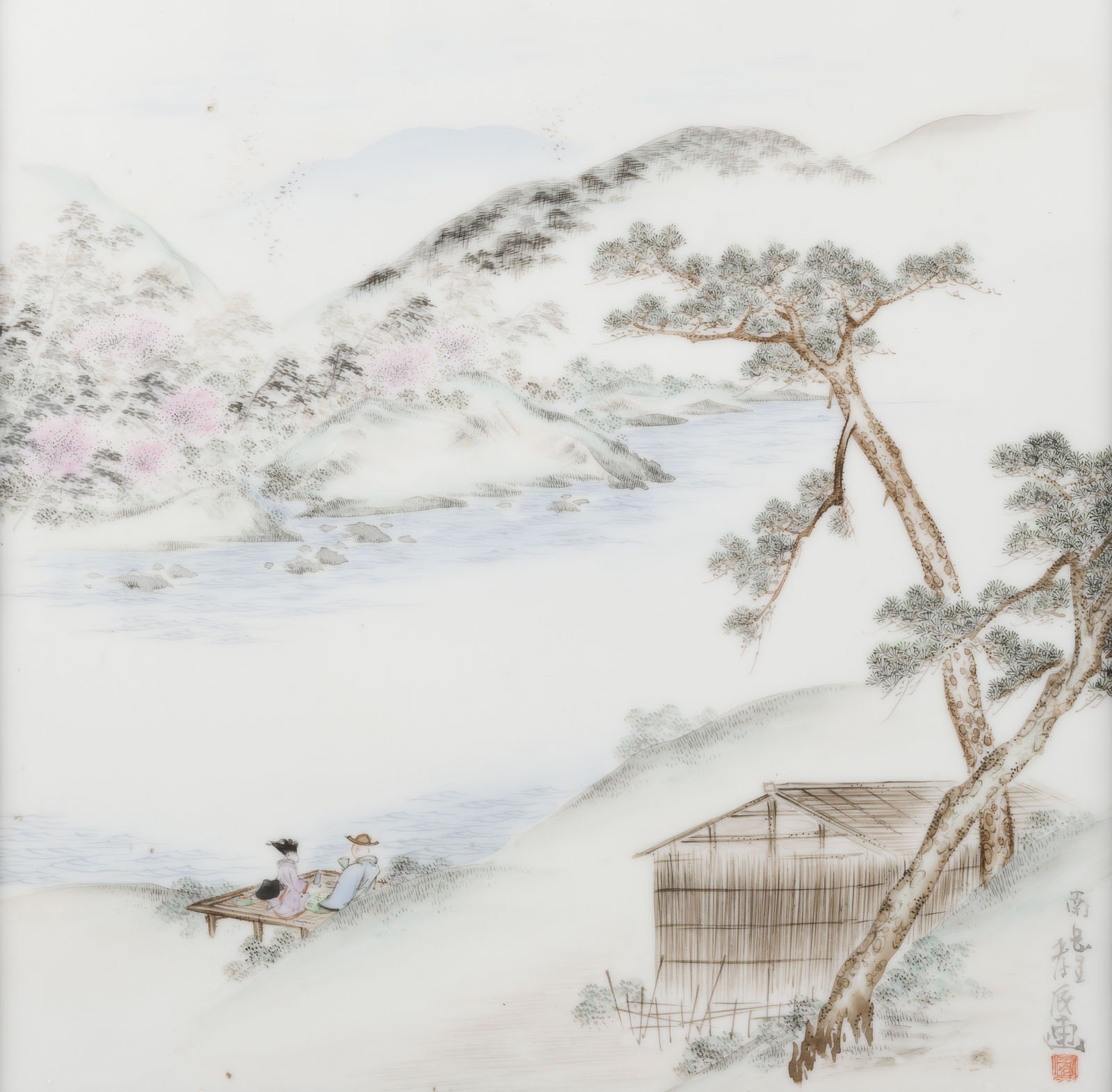 A WOOD-FRAMED PORCELAIN PLAQUE Japan, 19th/20th century Wood/porcelain. Ca. 25.5x25.5 cm. With traces of use and age, partailly abraded.