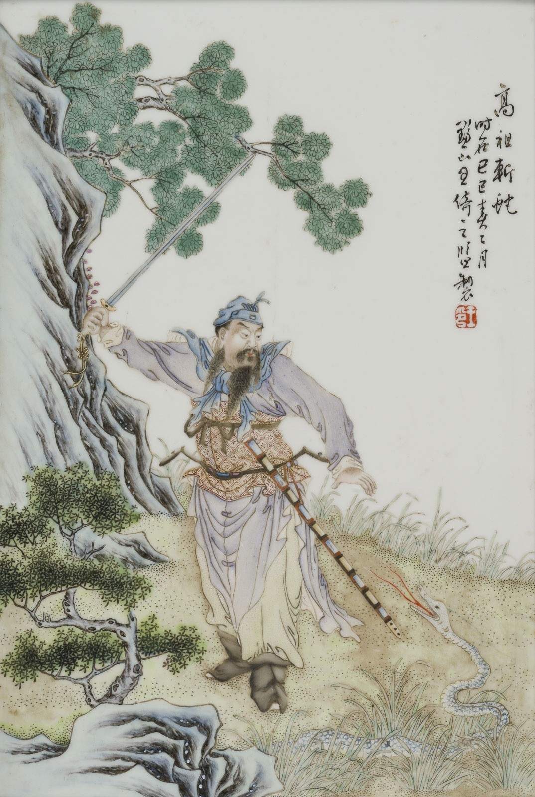 A WOOD-FRAMED QIANJIANG-CAI PORCELAIN PLAQUE China, late Qing Dynasty Porcelain/wood. 42.5x30 cm, framed. The plaque depicts the scene of "Gaozu Zhan She", with an artist's inscription and signature in the upper right corner. With traces of age, partially abraded. Provenance: From an old private collection in North Rhine-Westphalia.