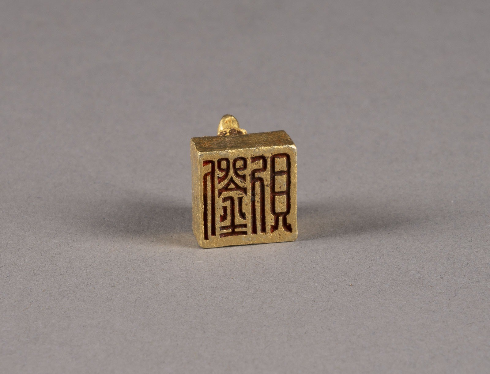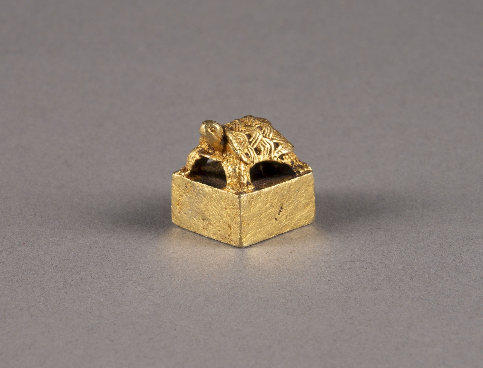 A GOLD SQUARE SEAL China, probably Han-Dynasty Gold. H 15 mm x L 13 mm x W 12.8 mm; Weight: 24.08 g. The gold seal is surmounted by a turtle finial, with the inscription in two-character seal script. With traces of age and use, partially abraded.