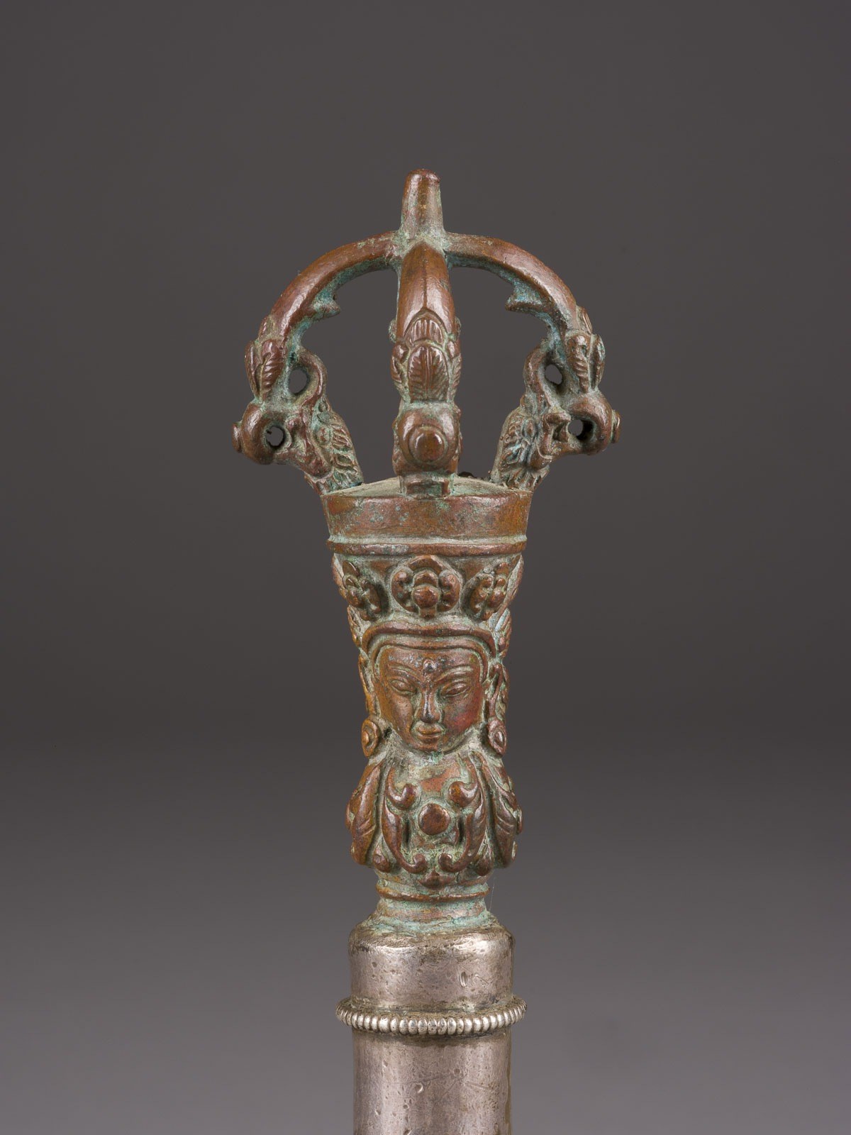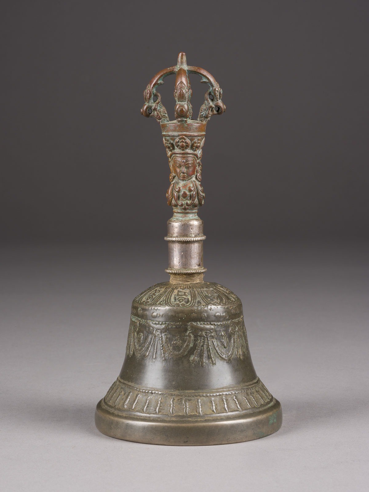 A COPPER-ALLOY RITUAL BELL (GHANTA) Tibet Copper alloy. H. 19 cm. The body is decorated in relief with eight seed syllables, vajra bands, and Kirtimukha garlands. The handle is formed as the head of Prajnaparamita, the embodiment of perfected wisdom. With traces of age and use, partially abraded, with the clapper missing. Provenance: From a private collection in North Rhine-Westphalia.
