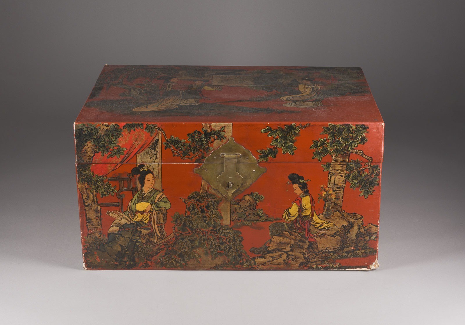 A RED LACQUERED WOOD 'FIGURAL' TRUNK China, 20th century Wood. H. 34.5x L. 66x W. 45.5 cm. With traces of use and age, partially abraded, damaged and cracked.