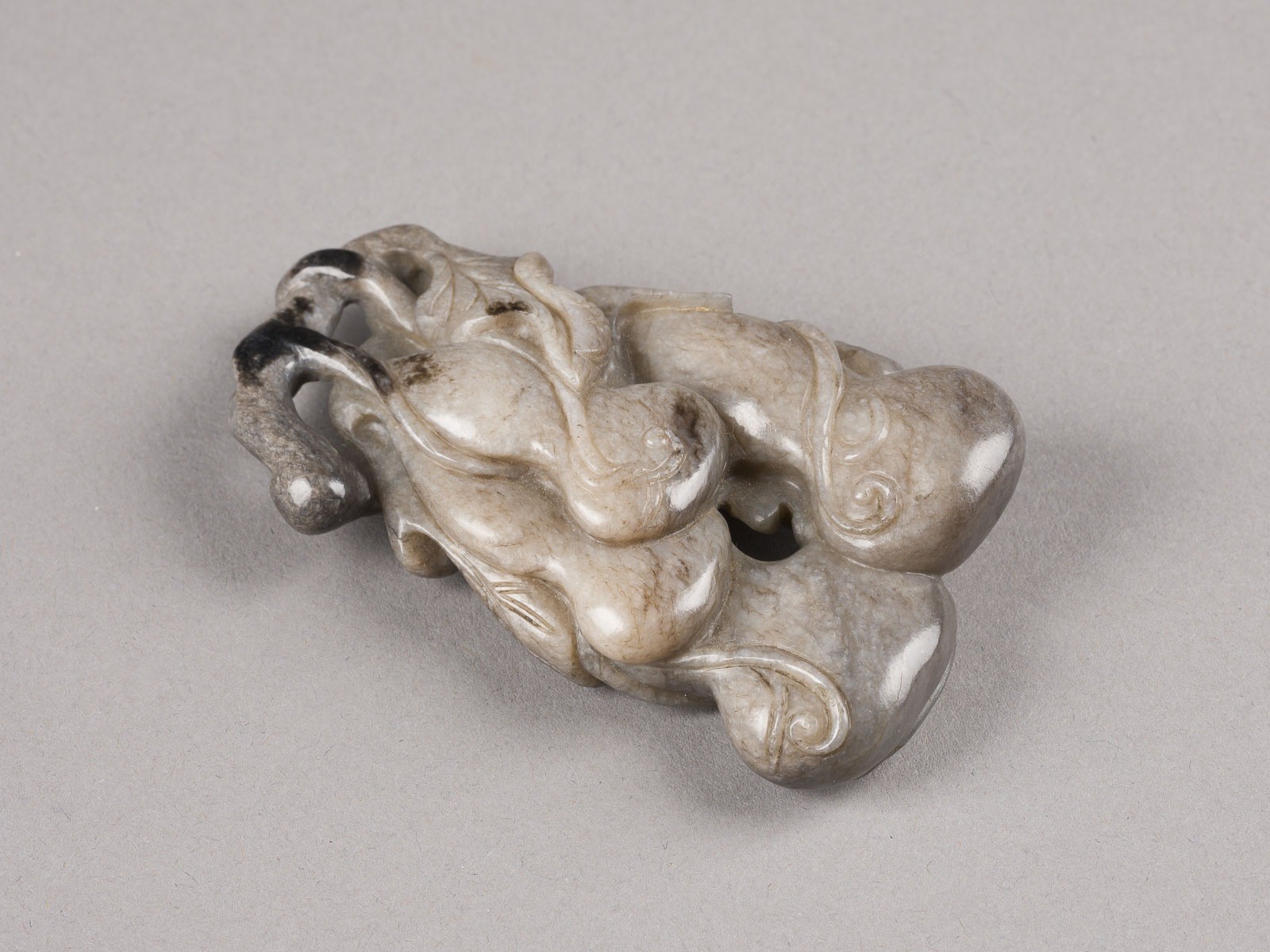 A BLACK AND GREY JADE CARVING OF DOUBLE GOURDS China, Qing Dynasty Jade. L. 7.4 cm. With traces of use and age. Provenance: From an old private collection in North Rhine-Westphalia.
