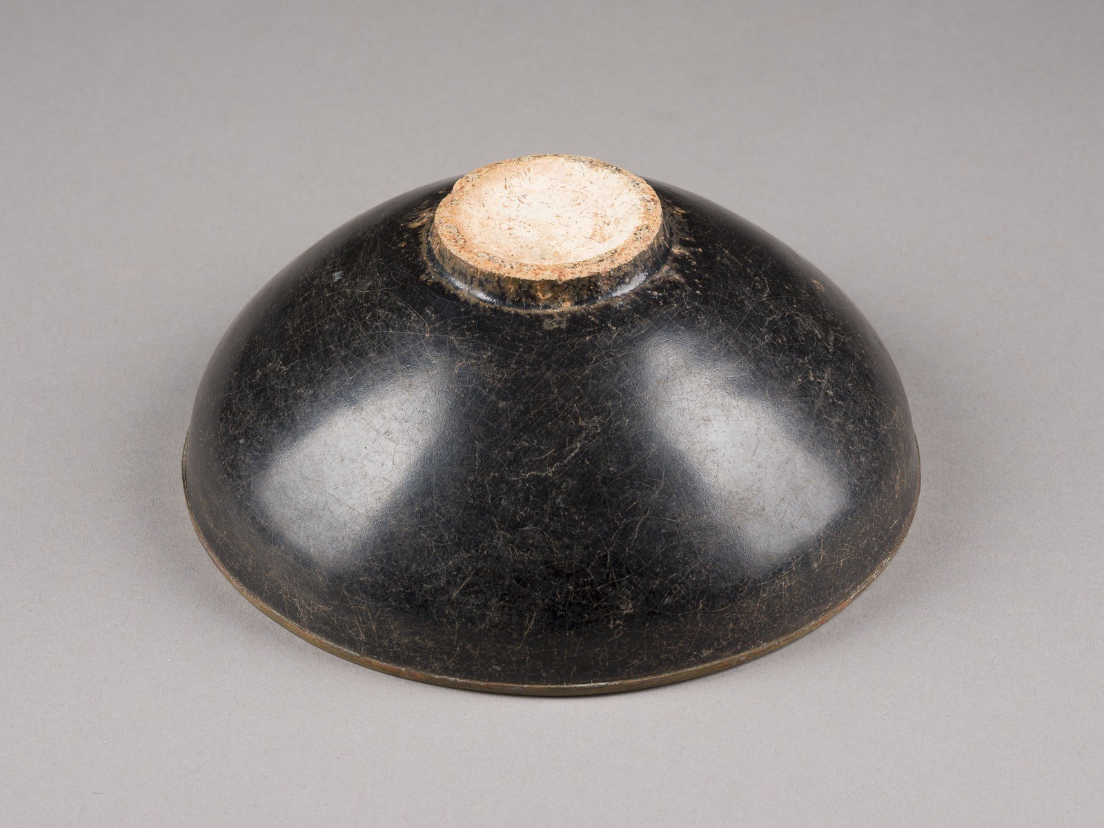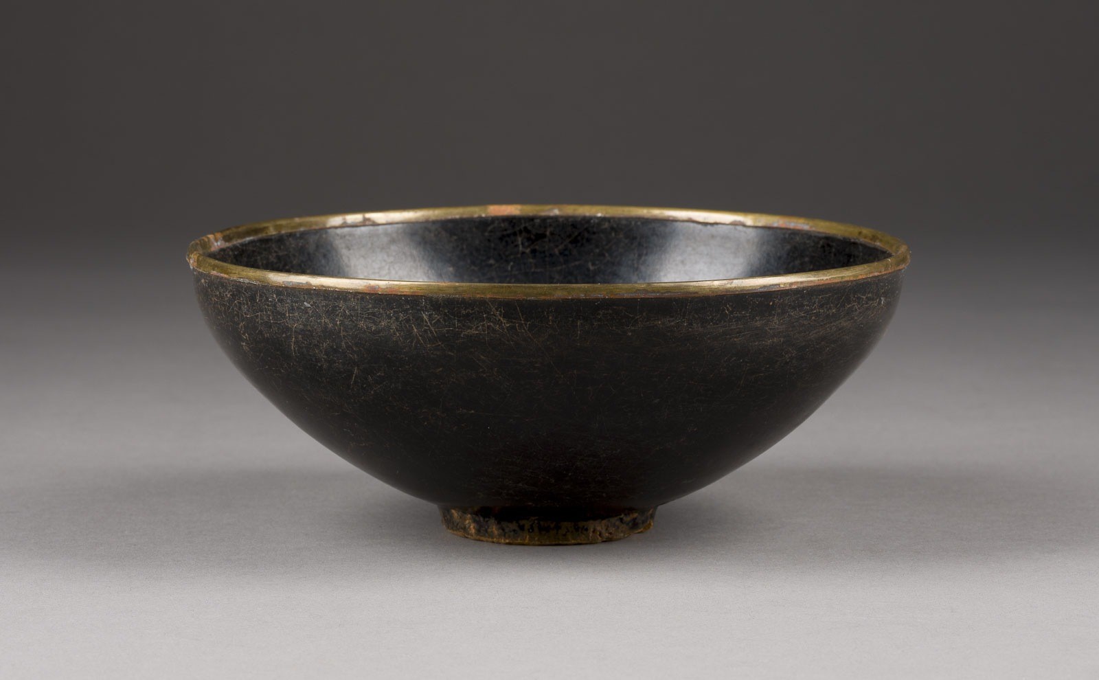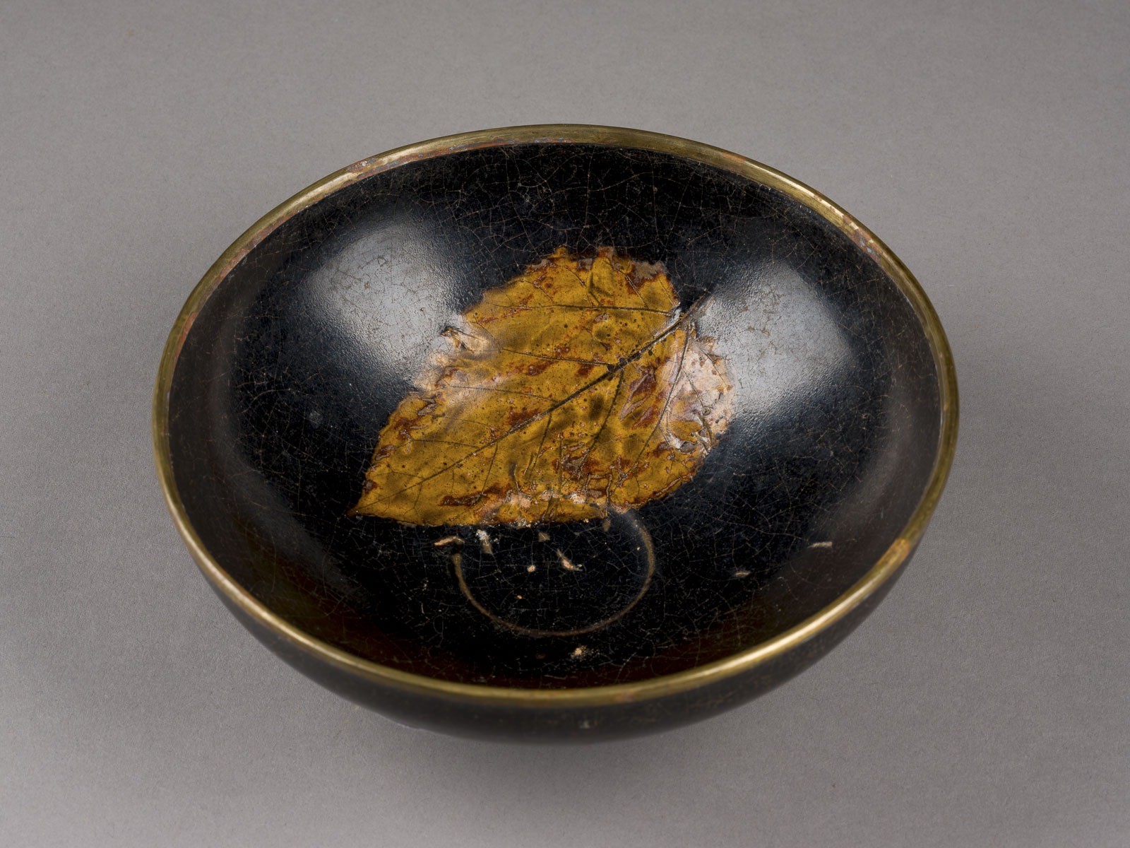 A RARE JIZHOU LEAF-DECORATED TEA BOWL China, probably Song-Dynasty Pottery. H. 6.3 cm. The bowl is coated with a black glaze on both the interior and exterior. The interior is decorated near the centre with a brownish-buff leaf. The rim is fitted with a brass band. With traces of use and age, partially cracked and abraded. Provenance: From a German private collection.