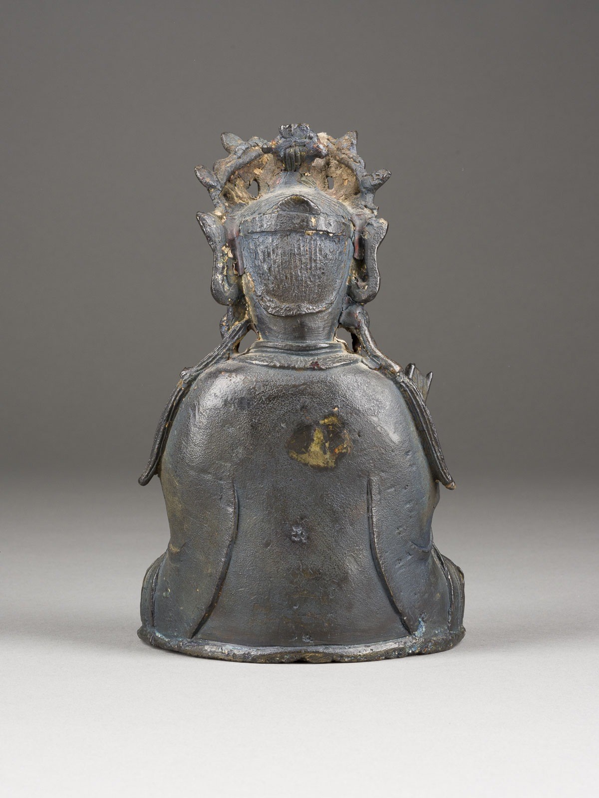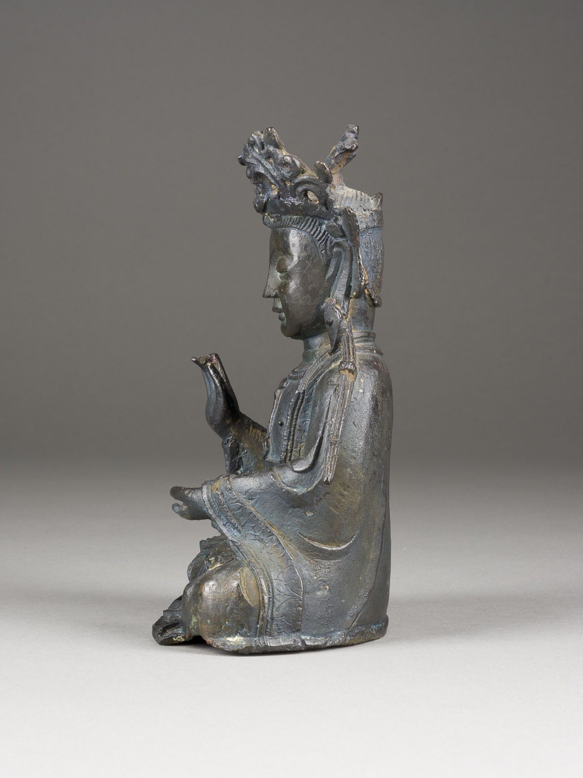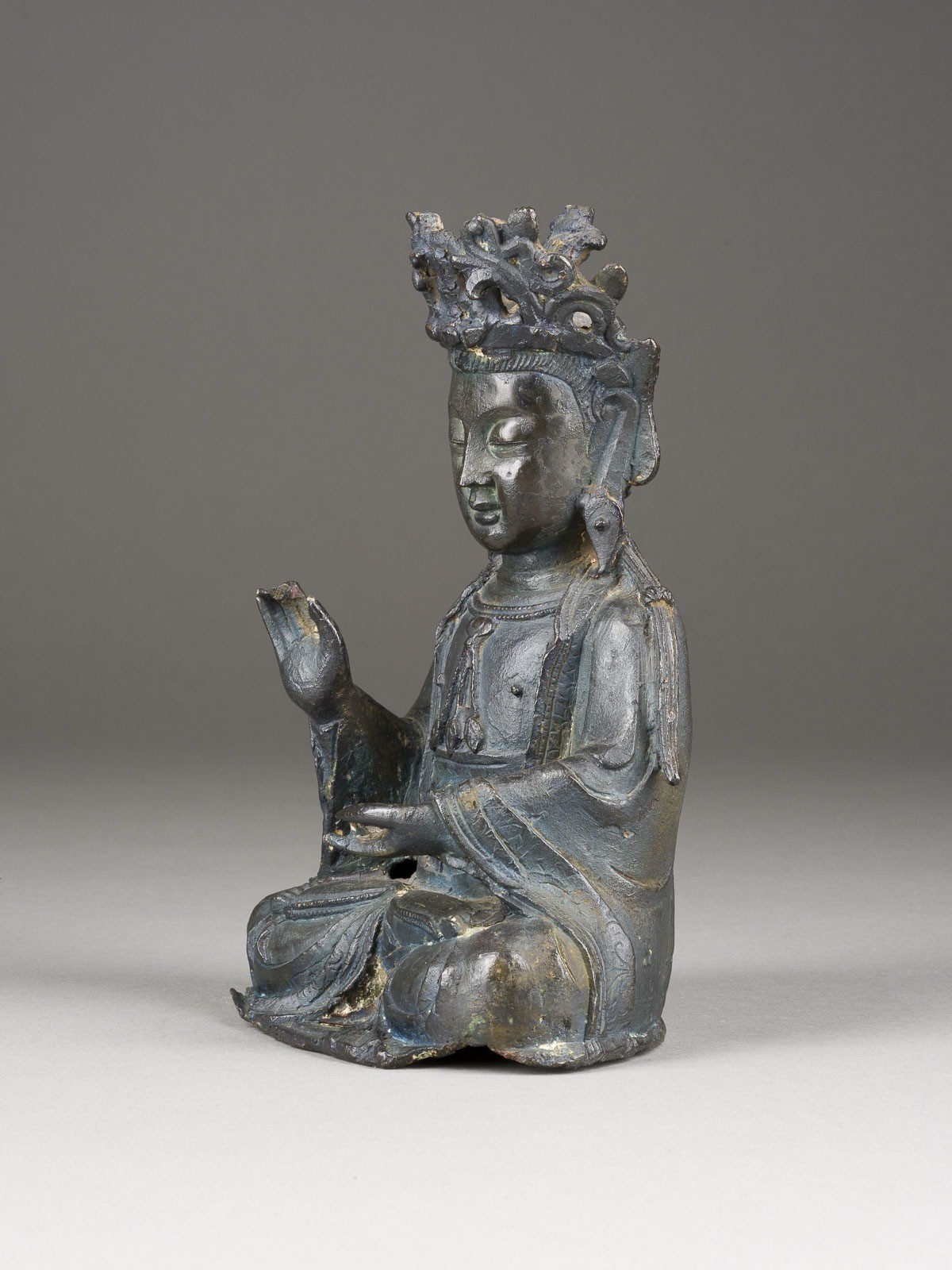 A BRONZE SEATED FIGURE OF GUANYIN China, Ming Dynasty Bronze. H. 20.5 cm. The crowned guanyin is seated in dhyanasana, with her right hand in varada mudra and left hand in vitarka mudra. With traces of age and gilding, partially abraded and damaged. Provenance: From an old private collection in North Rhine-Westphalia.
