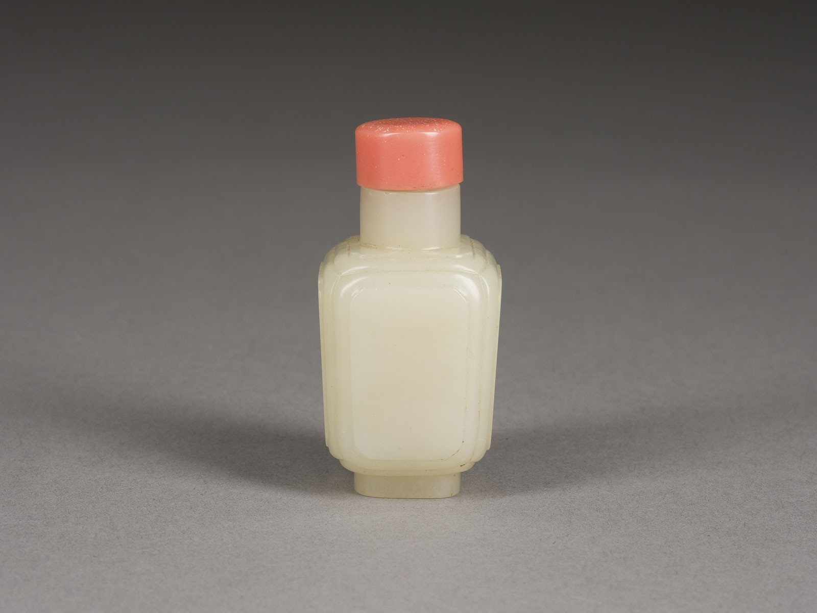 A WHITE JADE SNUFF BOTTLE China, Qing Dynasty Jade. H. 5.8 cm. A snuff bottle carved in a square form, fitted with a coral stopper. With traces of use and age. Provenance: From a private collection in North Rhine-Westphalia.