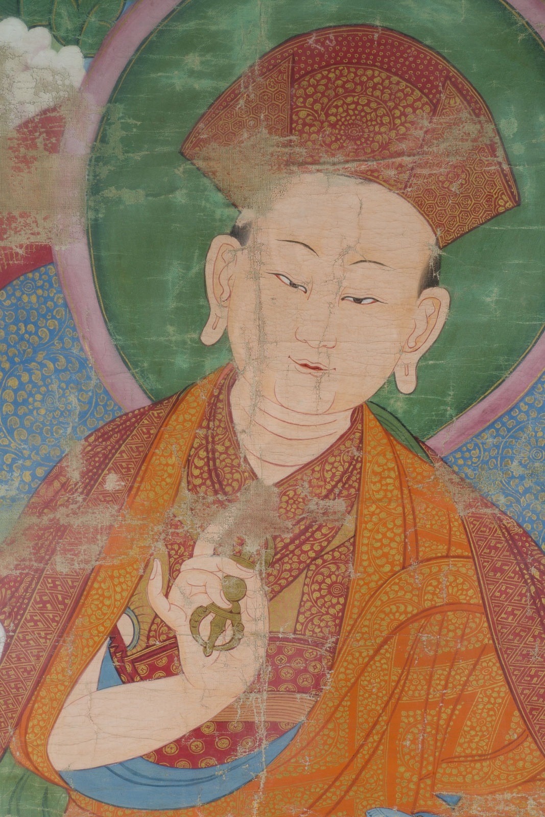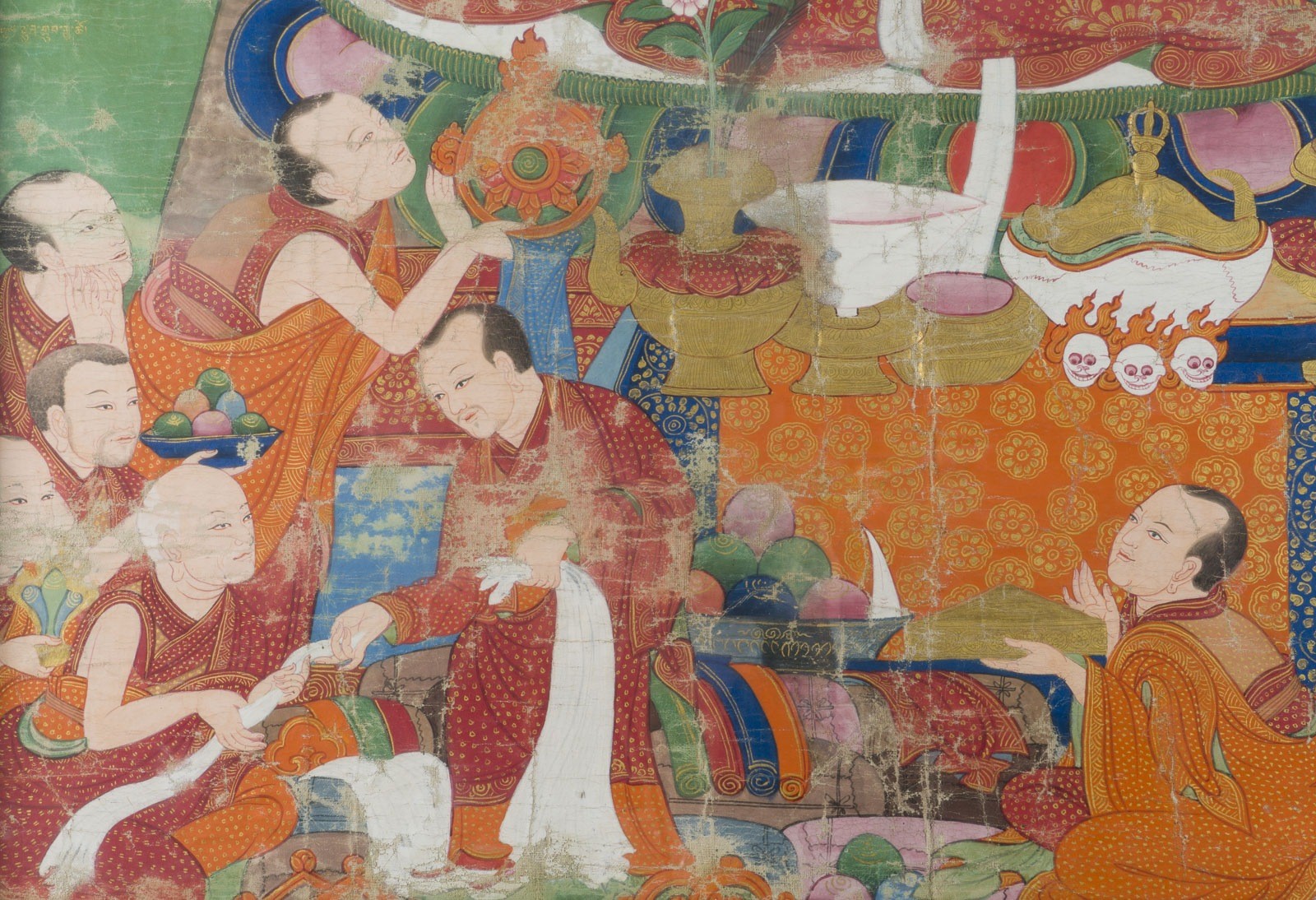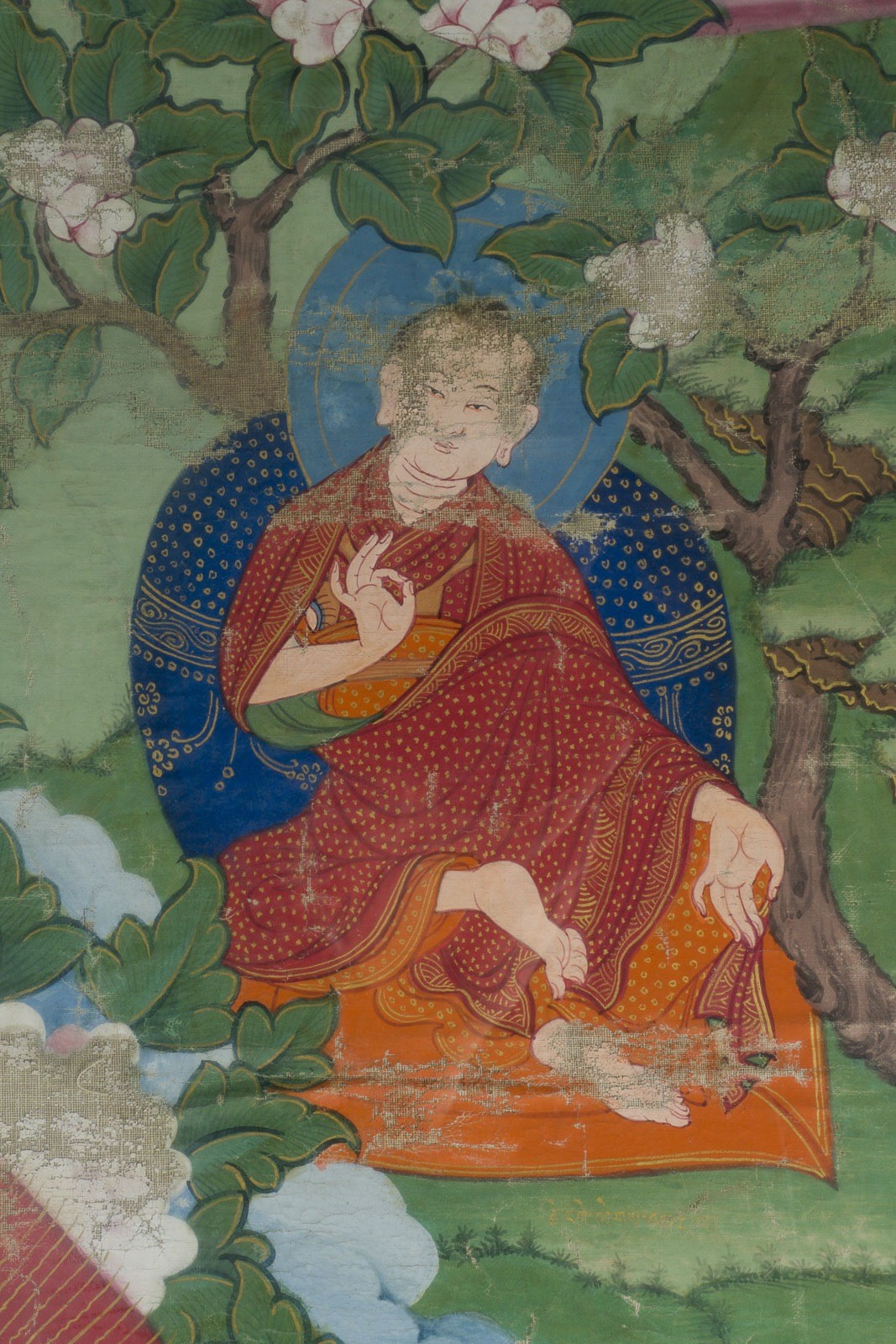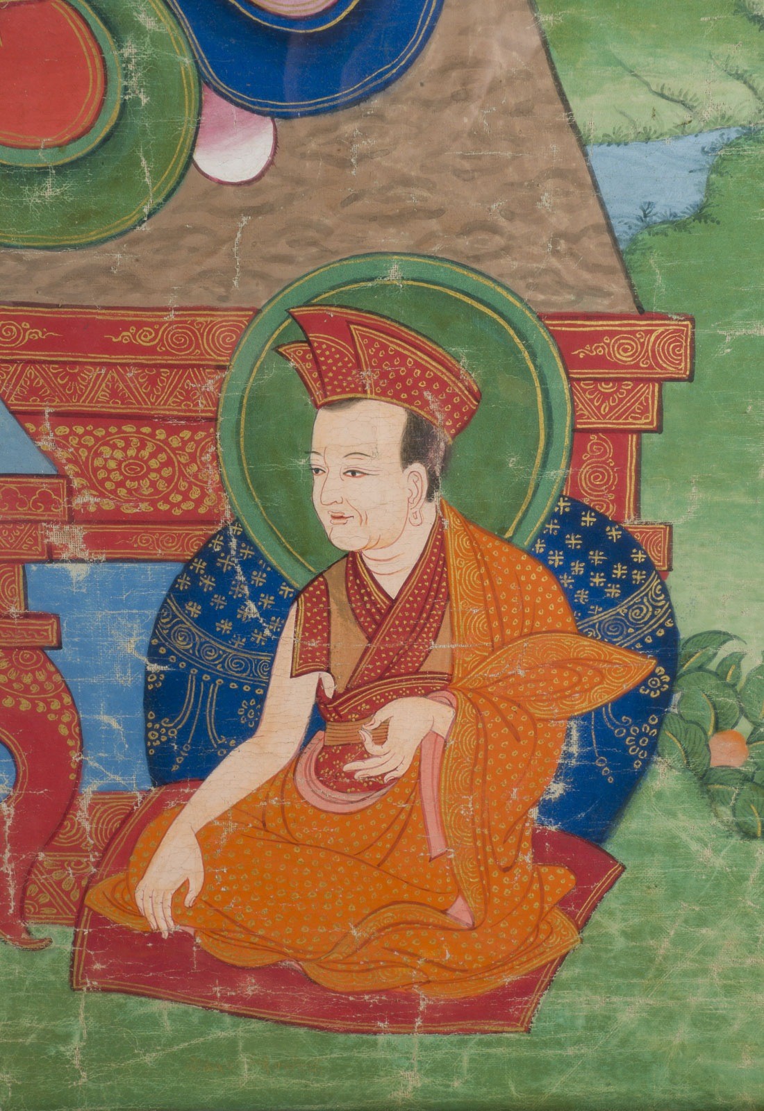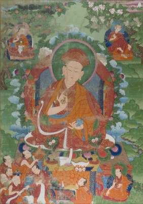 A THANGKA DEPICTING THE KARMAPA China (Tibet), 17th/18th century Ca. 119.8x85.8 cm. Distemper on cloth. The Karmapa, wearing red and saffron robes and the distinctive red hat of the Karma Kagyu lineage, holds the bell and vajra and is seated on a cushion over a throne. Before him stands an altar table with offerings. The scene is set in a flower-filled landscape, with a fruiting lychee tree at the upper left and a blossoming tree at the upper right. His attendants surround him. With traces of age, minor staining, some loss of color, and areas of creasing; the thangka is mounted and adhered to the backboard, and the reverse is not accessible for examination. Provenance: From a German private collection.
