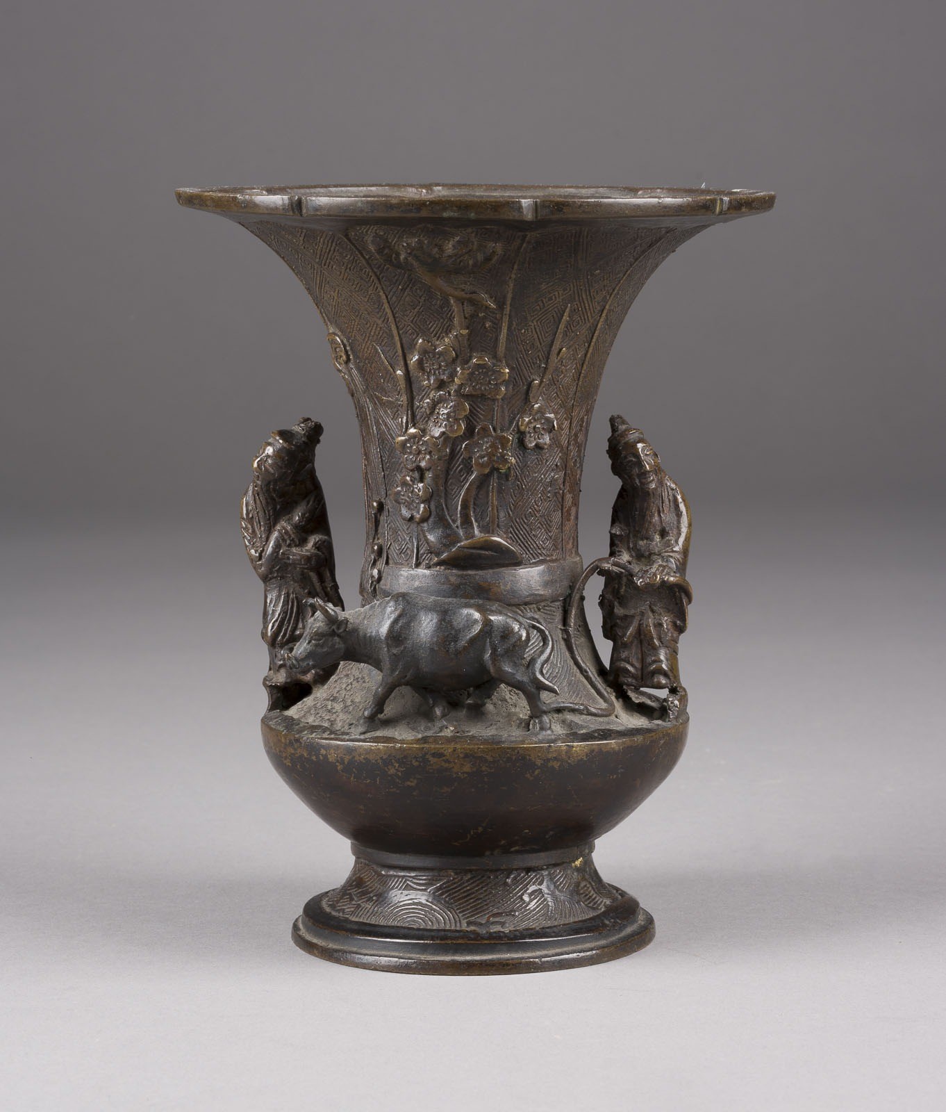 A BRONZE VASE WITH APPLIED FIGURES China, probably 19th century Bronze. H. 17.7 cm. With traces of age and use, partially abraded and damaged.