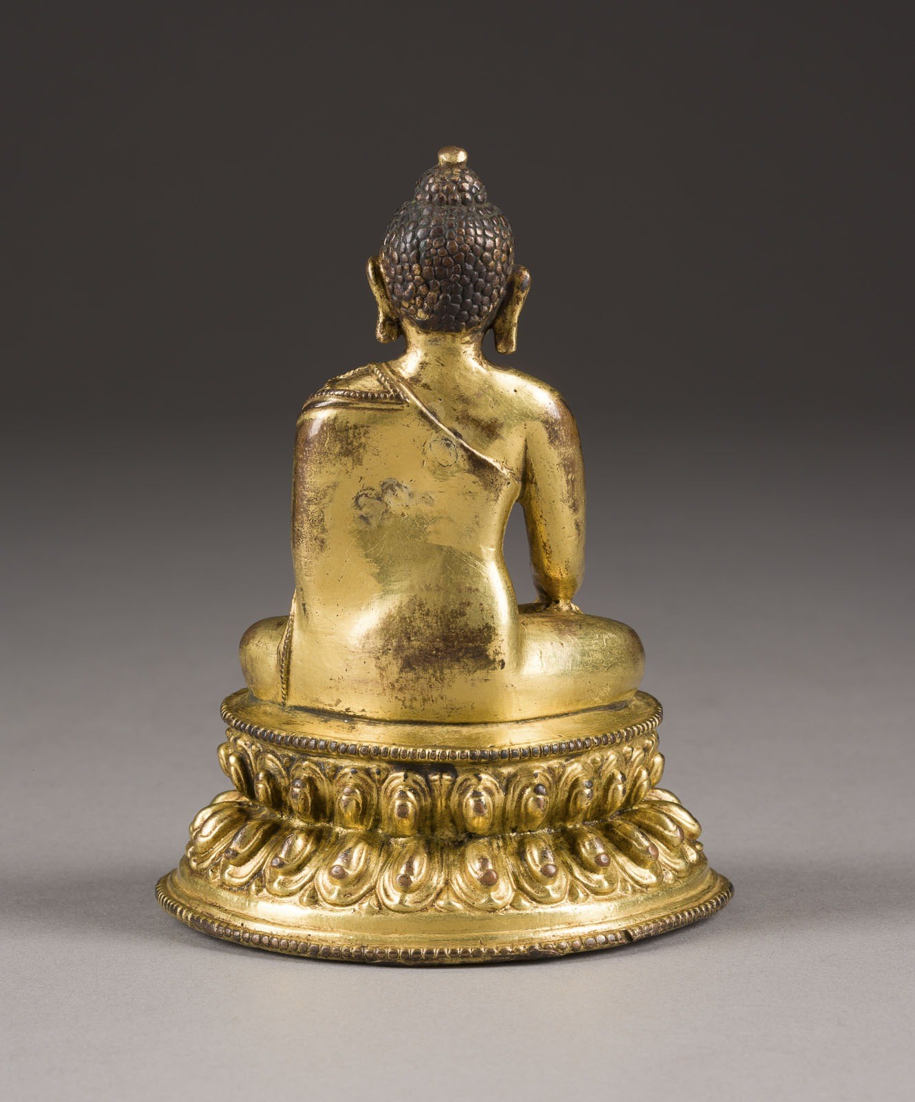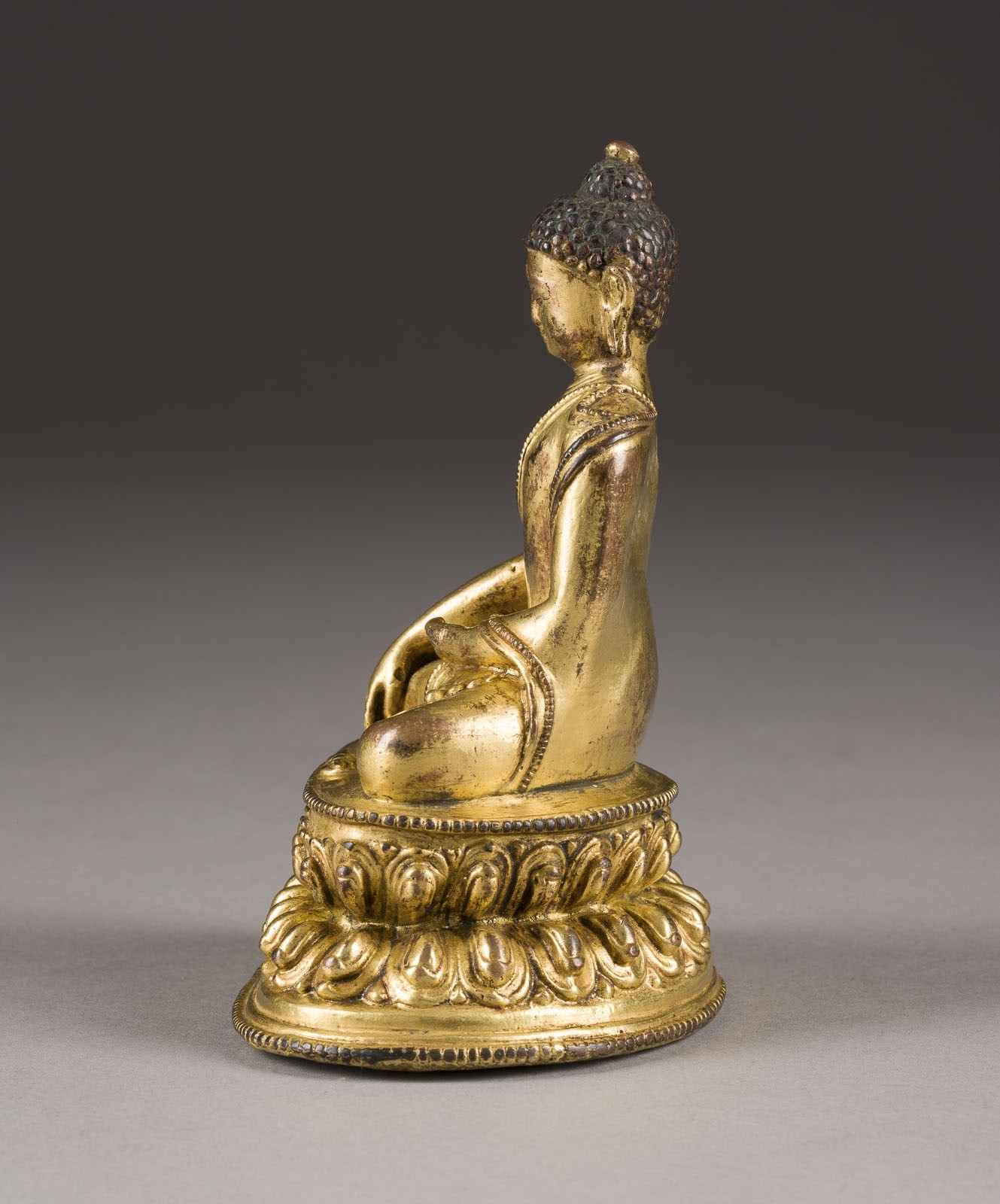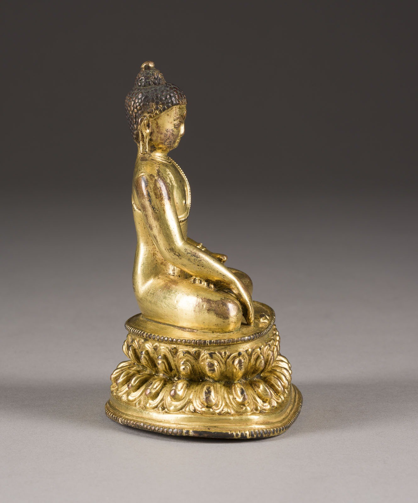 A GILT BRONZE FIGURE OF AKSOBHYA Tibet, probably 15th/16th century Bronze. H. 12.9 cm. Aksobhya is seated in vajrasana on a lotus base, with his right hand in bhumisparsa mudra. A small vajra is placed on the pedestal in front, emphasizing the iconographic features of Aksobhya. Partially abraded.