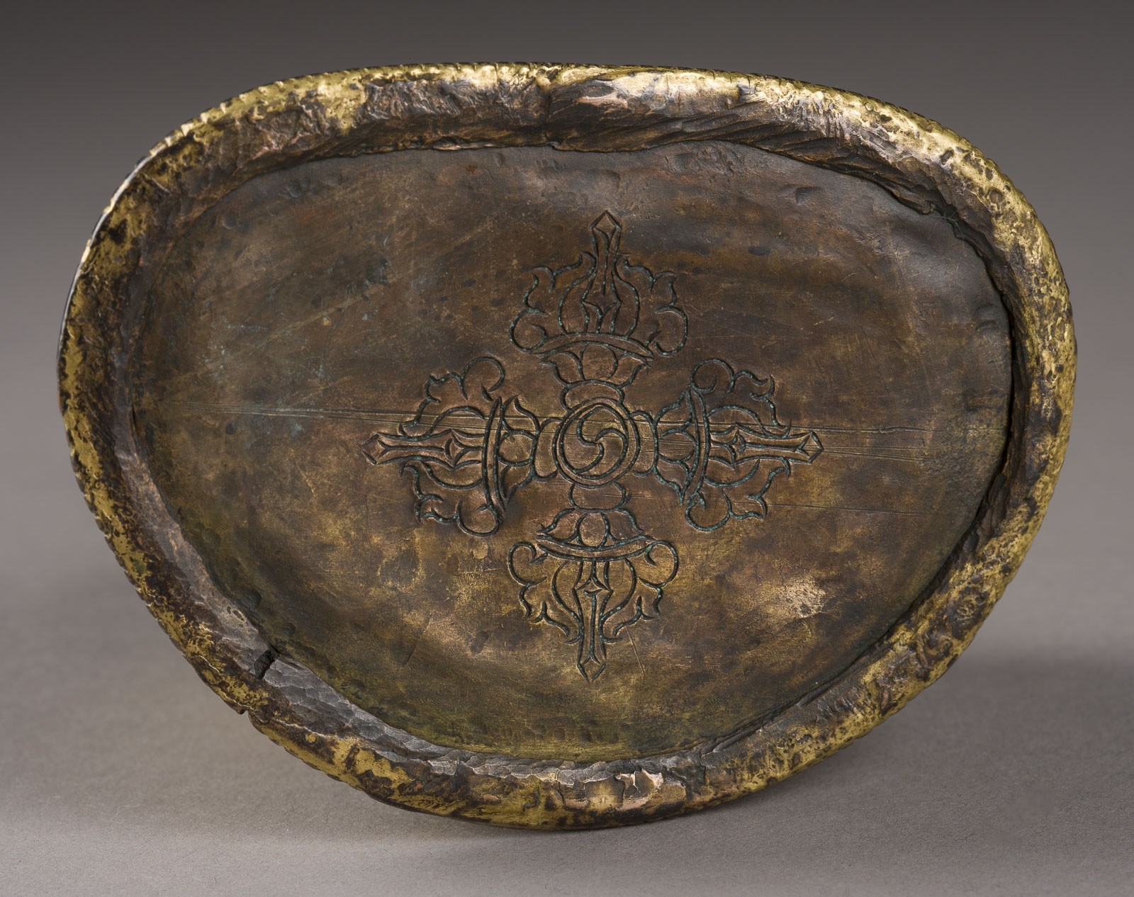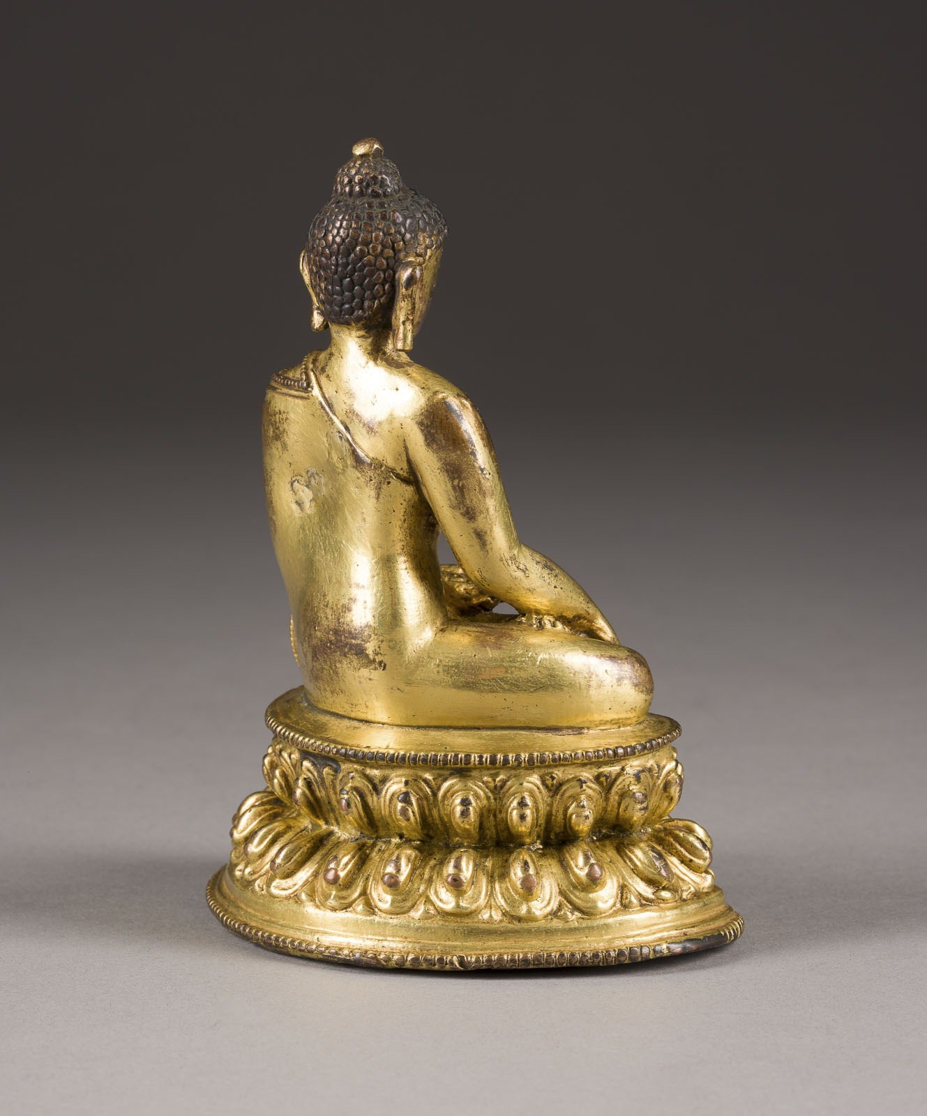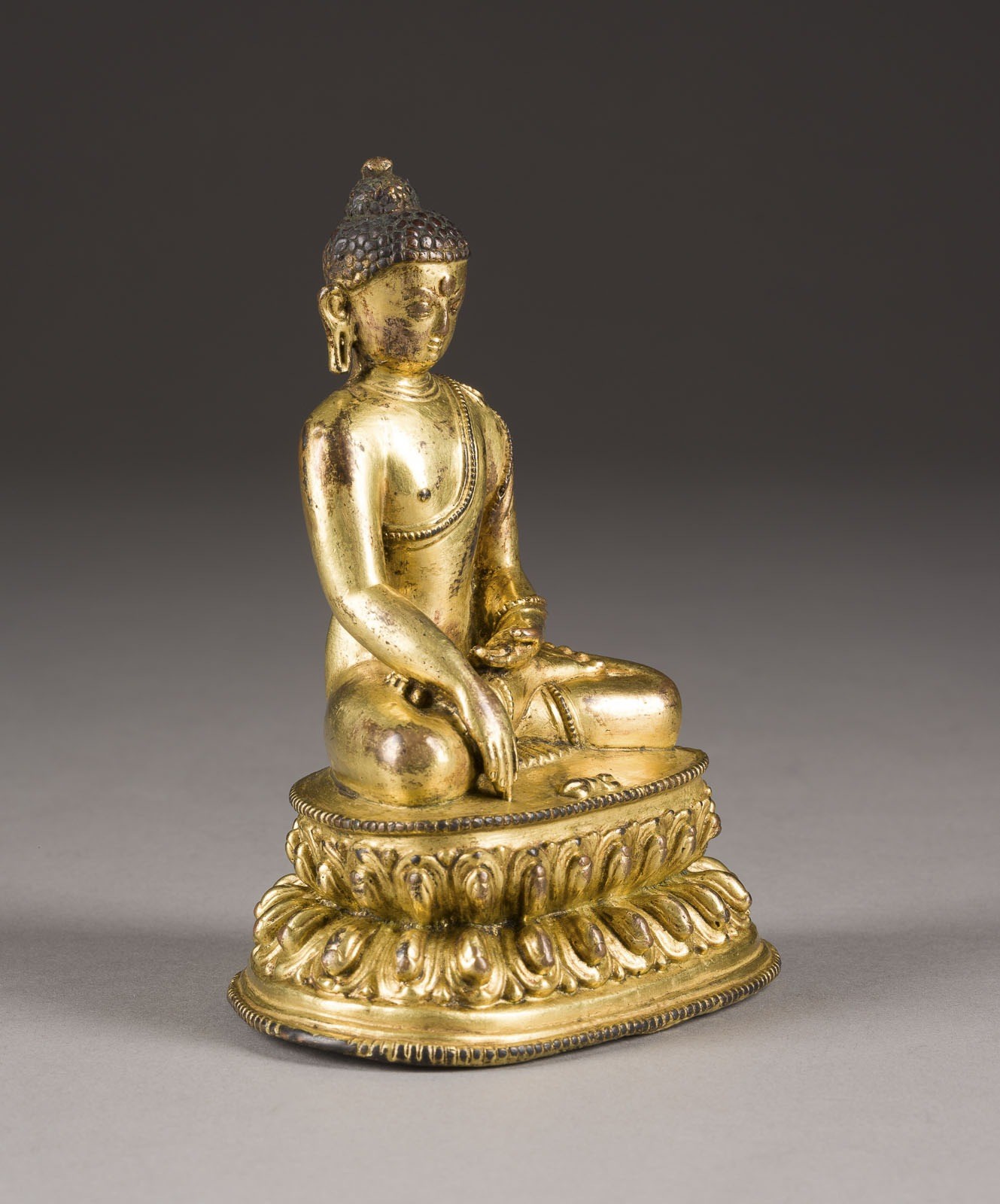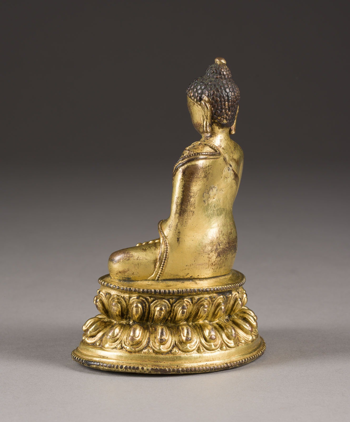 A GILT BRONZE FIGURE OF AKSOBHYA Tibet, probably 15th/16th century Bronze. H. 12.9 cm. Aksobhya is seated in vajrasana on a lotus base, with his right hand in bhumisparsa mudra. A small vajra is placed on the pedestal in front, emphasizing the iconographic features of Aksobhya. Partially abraded.