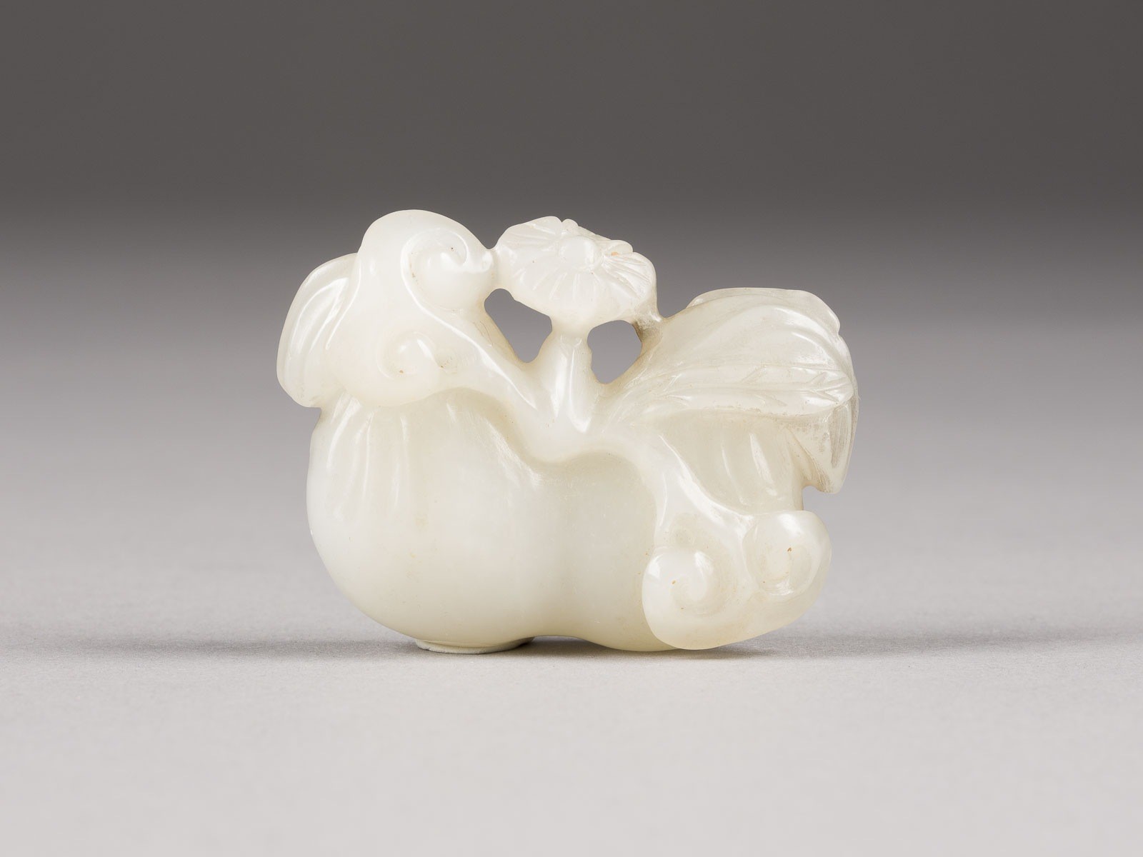 A WHITE JADE CARVING OF DOUBLE GOURD AND FLOWER China, 19th/20th century Jade. L. 4.9 cm. With traces of age and use.