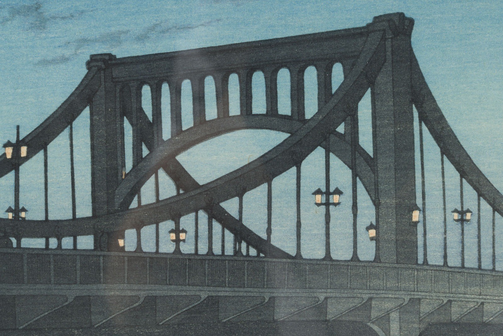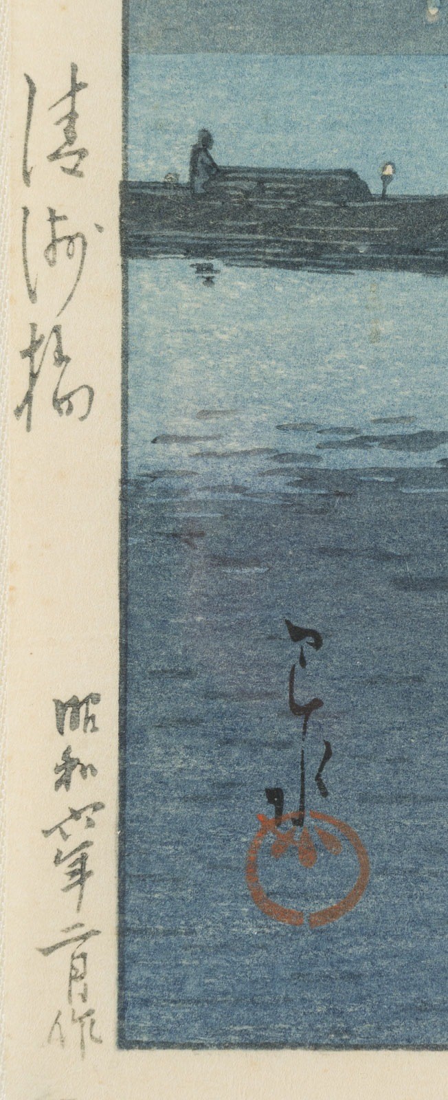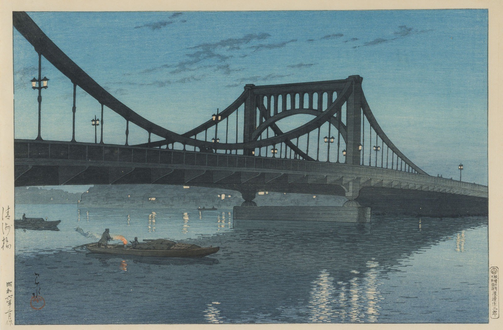 HASUI KAWASE 1883 - 1957 KIYOSUBASHI Japan, 1931 Woodblock print, framed and under glass. 26x39.2 cm. The print depicts the view of the Kiyosu Bridge in the early evening. Signed: Hasui. Seal: Kawase. Publisher: Watanabe Shsaburo. With traces of age. Provenance: From a private collection in North Rhine-Westphalia.