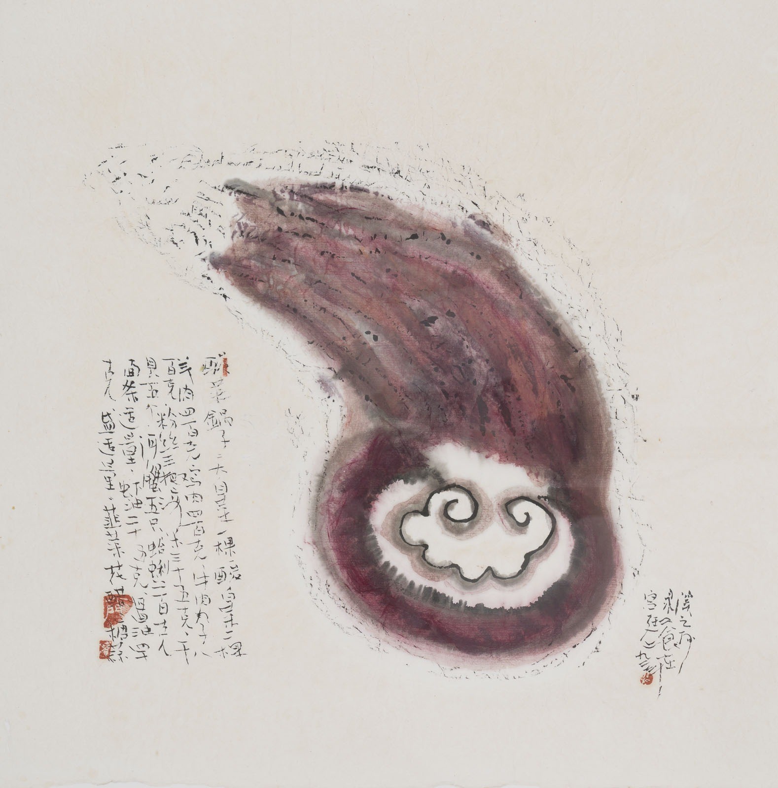 XIAOBAI SU 1949 CHINA UNTITLED (INK ABSTRACT) (C. 1995) Ink and color on paper, framed and under glass. 37.4 x 37.4 cm. This abstract ink work is inscribed with a line of poetry, signed by the artist, and bears four seals. Overall in good condition.